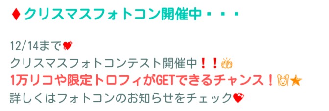 クリスマスのフォトコンが12/14まで開催していて報酬が1万リコやトロフィが貰えるそうなのでクリエイター予備軍になりたいユーザーは参加しまくると良いかもしれませんね(ΦωΦ)シランケドw
