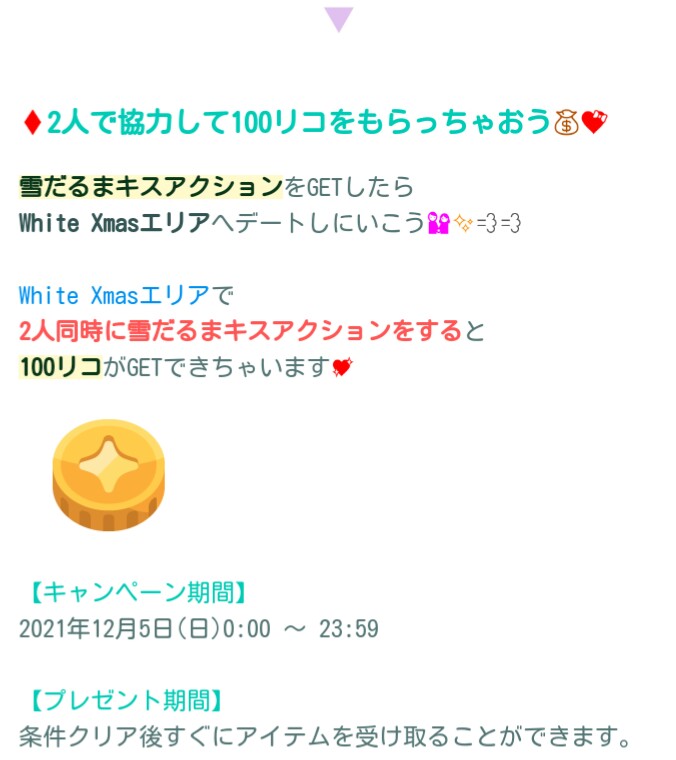 そして回収した雪だるまキスアクションを2人で同時に行うと100リコが貰えるそうです。