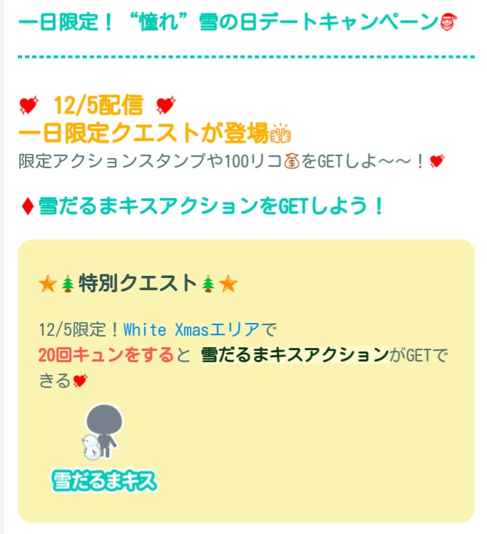 12/5当日限定でホワイトクリスマスエリアにて20回きゅん(これ系はきゅんリストからでも達成可能だったりするw)すると雪だるまキスというアクションが貰えるそうですが…これはファニースタンプでは?って思ったのですが…アクションアバターが無いけどどうなんでしょうかね?(ΦωΦ)シランケドw