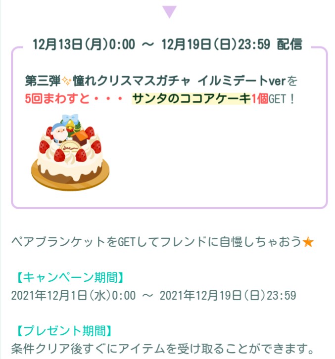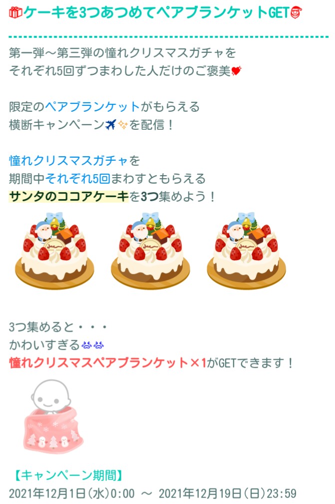 それを書くイベントシーズン毎にココアケーキを合計で3つもらえればペアブランケットが貰える。