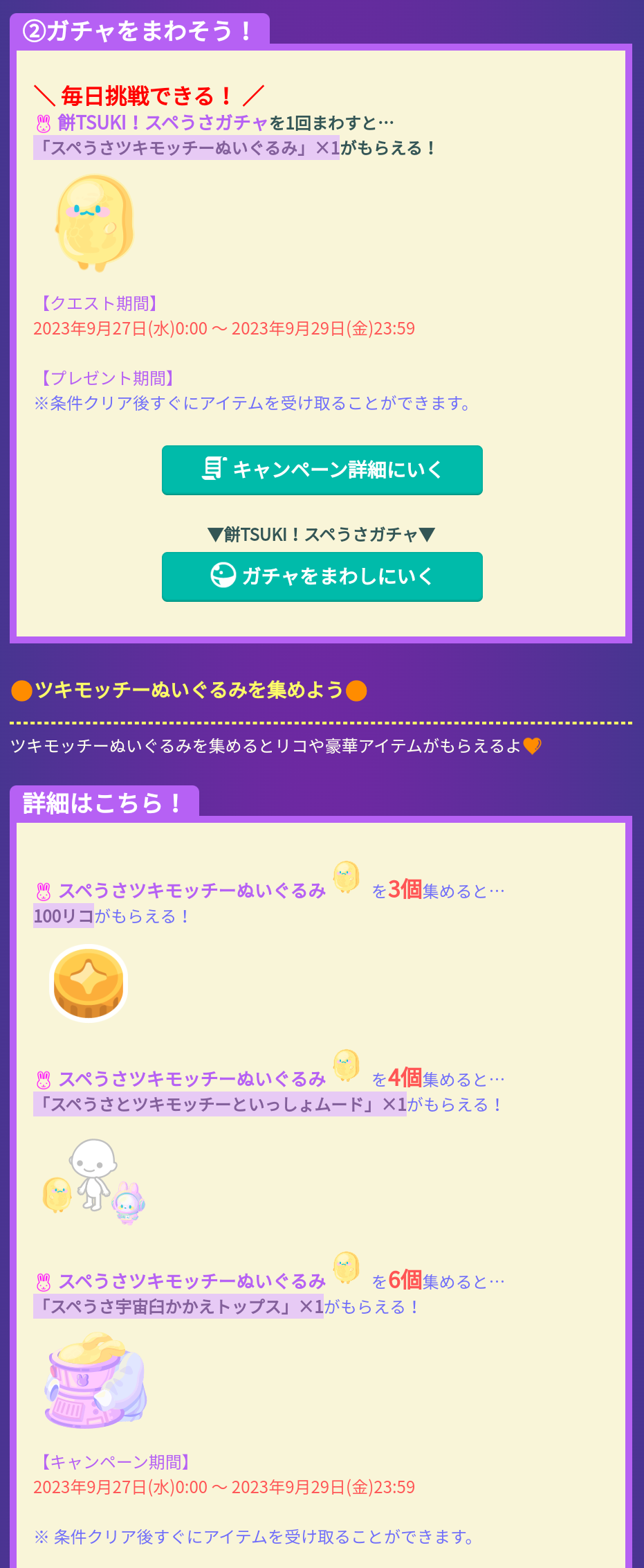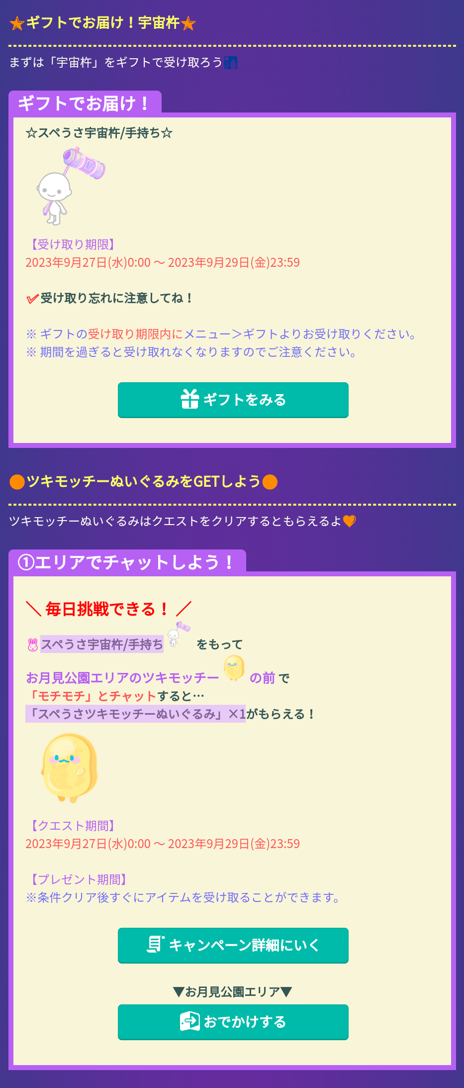 まず貰えるのがログインボーナスでの宇宙杵。これを貰ったら装着にてお月見公園エリアに移動して黄色い着ぐるみを着ているNPCの『ツキモッチーの前(上下左右)で【モチモチ】とチャット』することでツキモッチーのぬいぐるみ(もようがえアイテム)が貰えるのでこれをドンドン集めていくのが今回のクエストみたいです( ..)φメモメモ