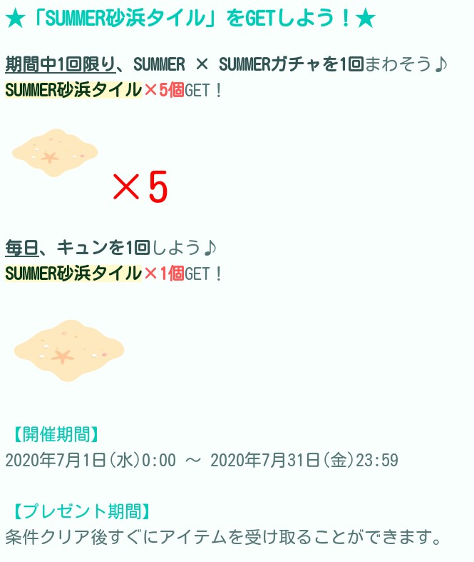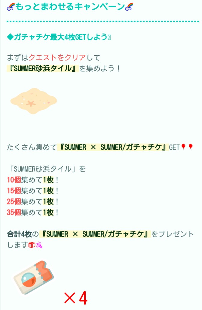 ◎砂浜のタイルを集めた枚数で規定でSUMMER×SUMMERガチャのガチャチケが最大で4枚貰えるよ♪