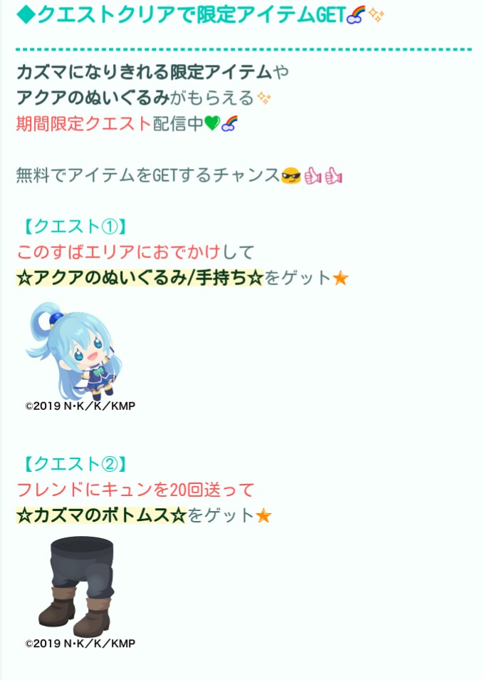 こちらでは映画 この素晴らしい世界に祝福を!紅伝説とのコラボでセットアップコーデのアバターが貰えるキャンペーンが開催されているので記録していきますね(^_-)-☆