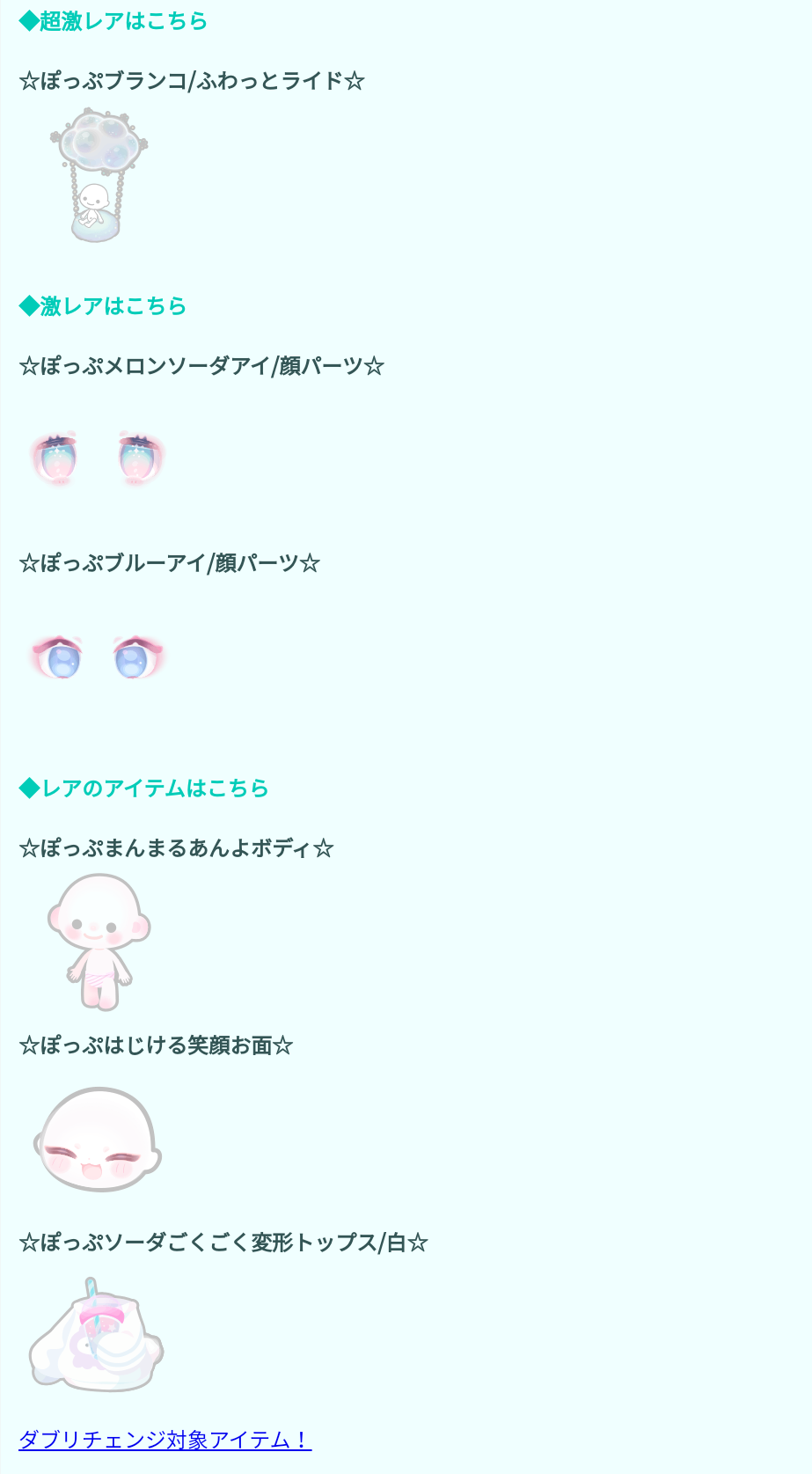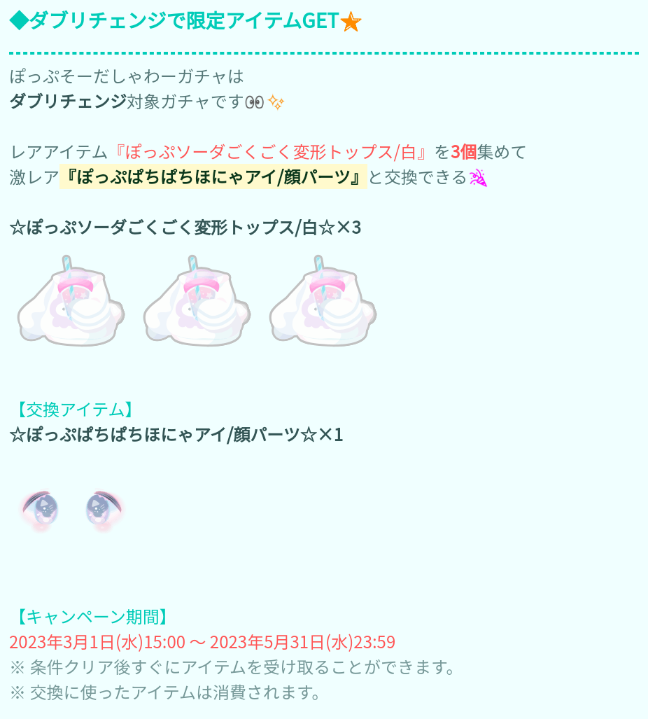 ダブリチェンジ内容ではレア設定での腕変形シリーズのトップスが3個も必須で顔パーツの目と交換となっているのでハードルが高めなんだけど~その割にこうかんできる顔パーツの目のクオリティに価値を感じにくいと思ったのはダデェだけでしょうか?(´ε`;)ウーン…ww