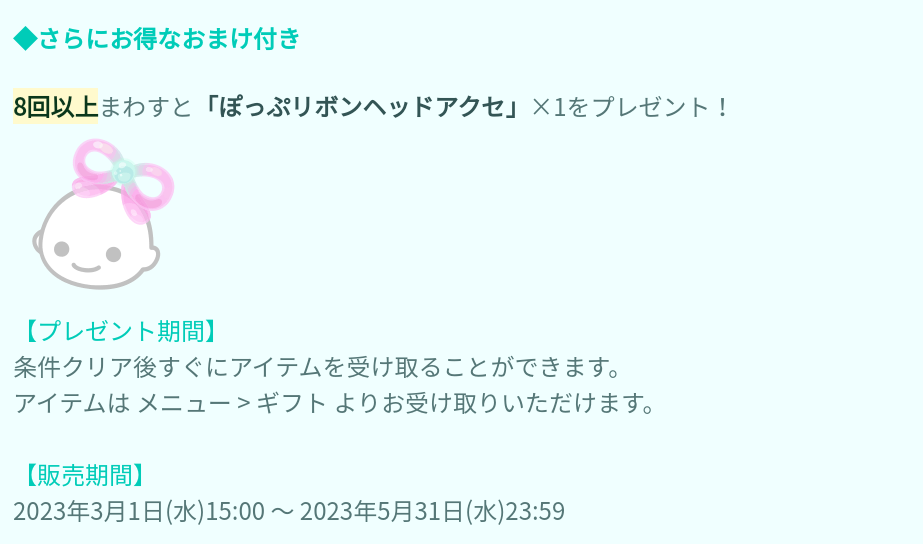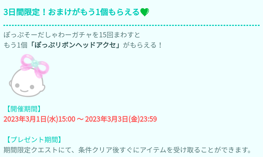 おまけ内容では初回の連ガチャではあと2回届かないという8回数でのヘッドアクセとなっていて更にそれが販売開始から3日間限定クエストとして合計15回回せばもう1個ヘッドアクセが貰えるそうなんだけど~…正直そんだけ焦って回す必要性ってあるのだろうか?(´・ω・`)