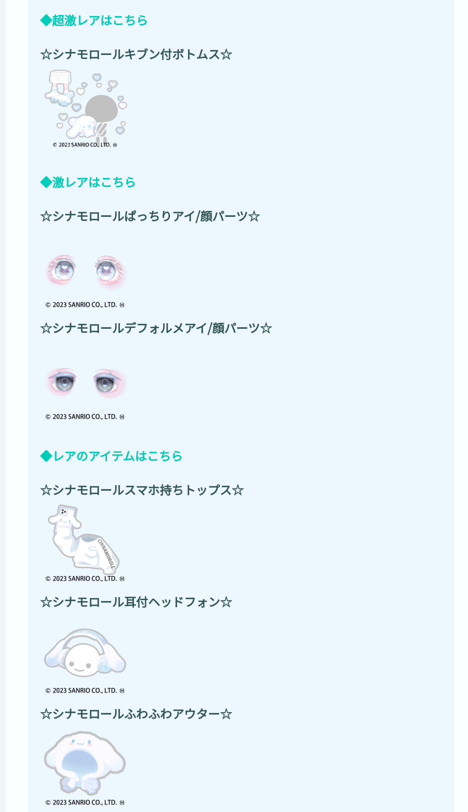 そしてレア設定の方ではスマホで上から自撮りをしているように見える腕変形シリーズのトップス、そして耳付きヘッドフォン、シナモロールの顏がついているドデカアウターとコチラの方は逆にコラボ感満載という意味では〇なんじゃない?(ΦωΦ)タシカニ