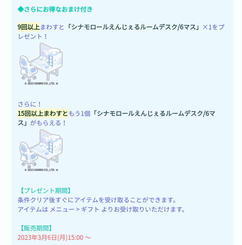 おまけ内容では初回の連ガチャでは貰えない9回と搾取なんだけど~もようがえアイテムの6マス分もあるルームデスクが貰えるというお部屋で常に行動するシナモロール推しのユーザーにはとても良いおまけ内容となっているようです(ΦωΦ)シランケドw
