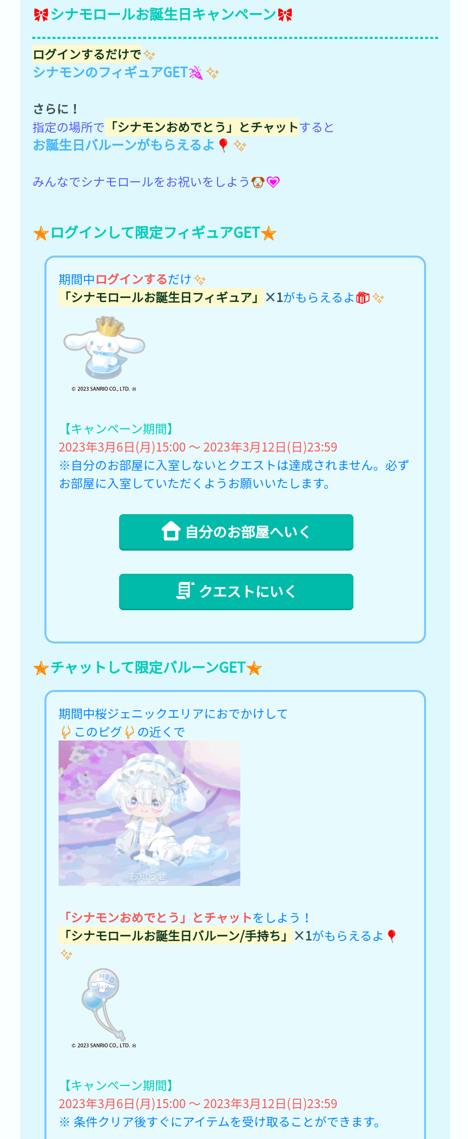 唯一無課金ユーザーもシナモロールとのコラボに参加できる内容がこちらのログインボーナスと〜桜ジェニックエリアにてシナモロールコラボ服を着ているNPCの周辺にて『シナモンおめでとう』とチャットすることで風船が貰えるそうなのですが~無課金ユーザーでの推しの場合はこれだけだと満足は出来ないんだろうなぁって思えるほど仕方なく参加できるクエストとして設定されてそうですね(ΦωΦ)シランケドw