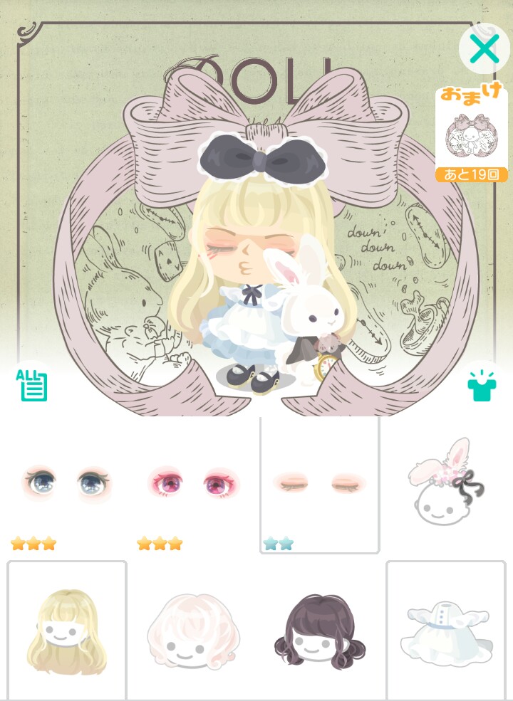アレだねwアリス自体で人気を取ろうとしているんではなく、連ガチャでの顔パーツの目の確定やおまけのムードなどで釣っているだけって感じがピグパブランドなのに残念極まりない紹介の仕方だなぁ…って思いました( ´ー`)フゥー...