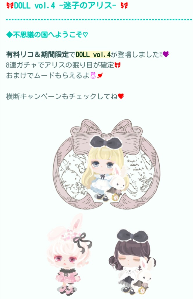 はいwでは今回は横断キャンペーンの中に組み込まれている上で更にピグパブランドとしてアリスを使ったネタの有料ガチャより「DOLL vol.4 迷子のアリス」が登場したので記録していきますね(^_-)-☆