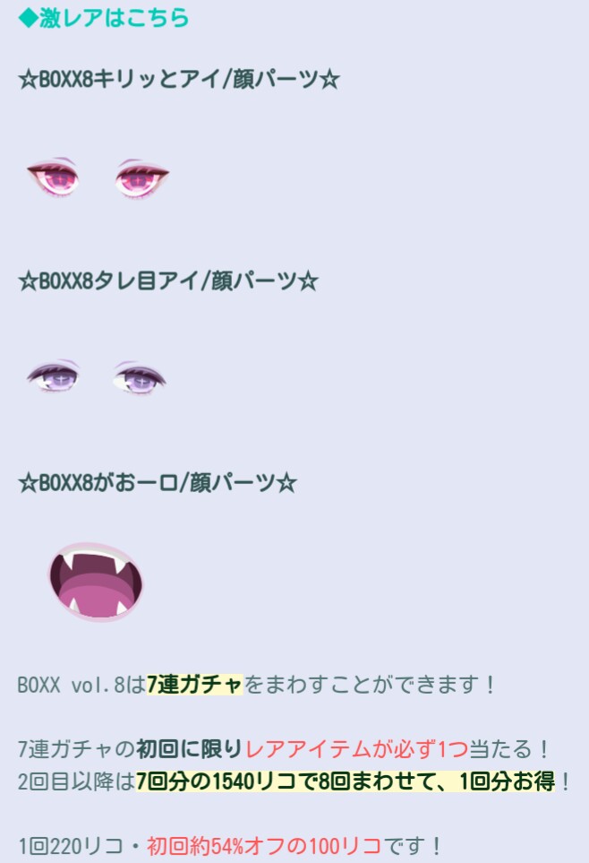 顔パーツの目で釣っているから口パーツが激レアなのにハズレ枠的な存在で顔パーツの目を当たらせないようにしている感が濃厚な内容ですねw