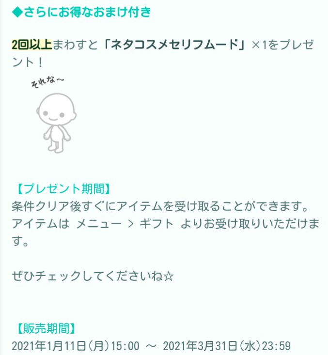唯一のムードとして文字ムードが貰えるのが2回という設定ですが、1回に掛かる費用が400リコ(有料)と割高なので実質800円の課金でこのムードを購入したって思うなかで高いか安いかを考えてからぶん回すと良いかと思いましたw