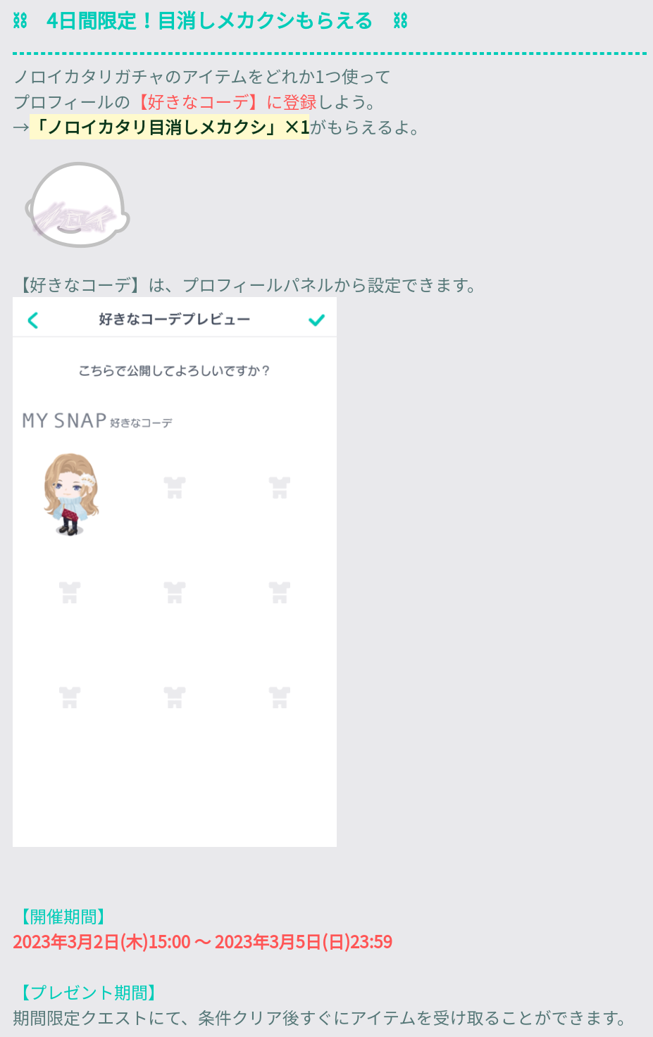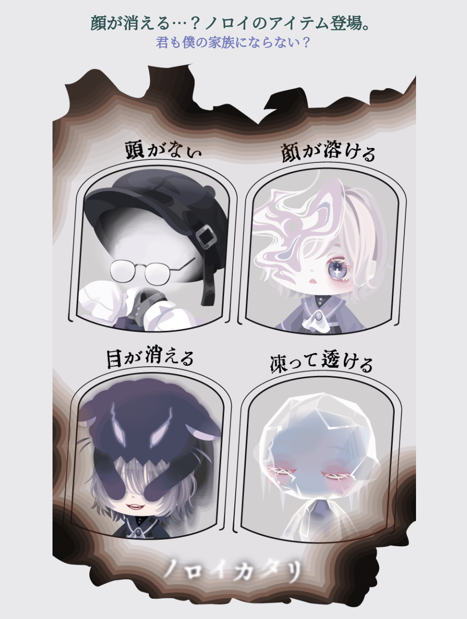 販売開始から4日間限定クエストとしてこのノロイカタリのアバターを好きなコーデ登録で使用することで目消しメカクシアバターがもらえるといった一風変わったクエスト内容となっています( ´_ゝ`)フーン