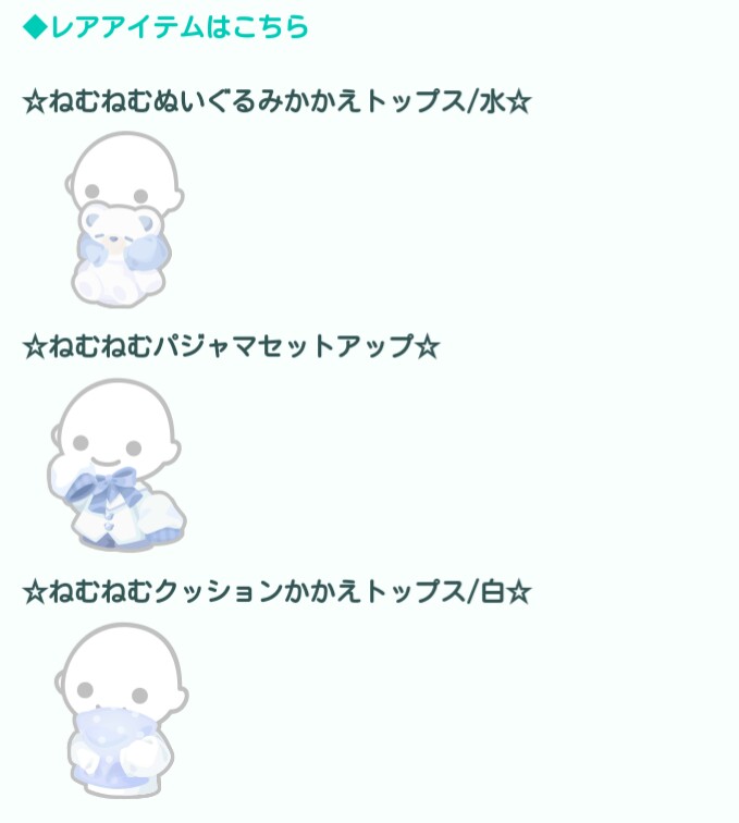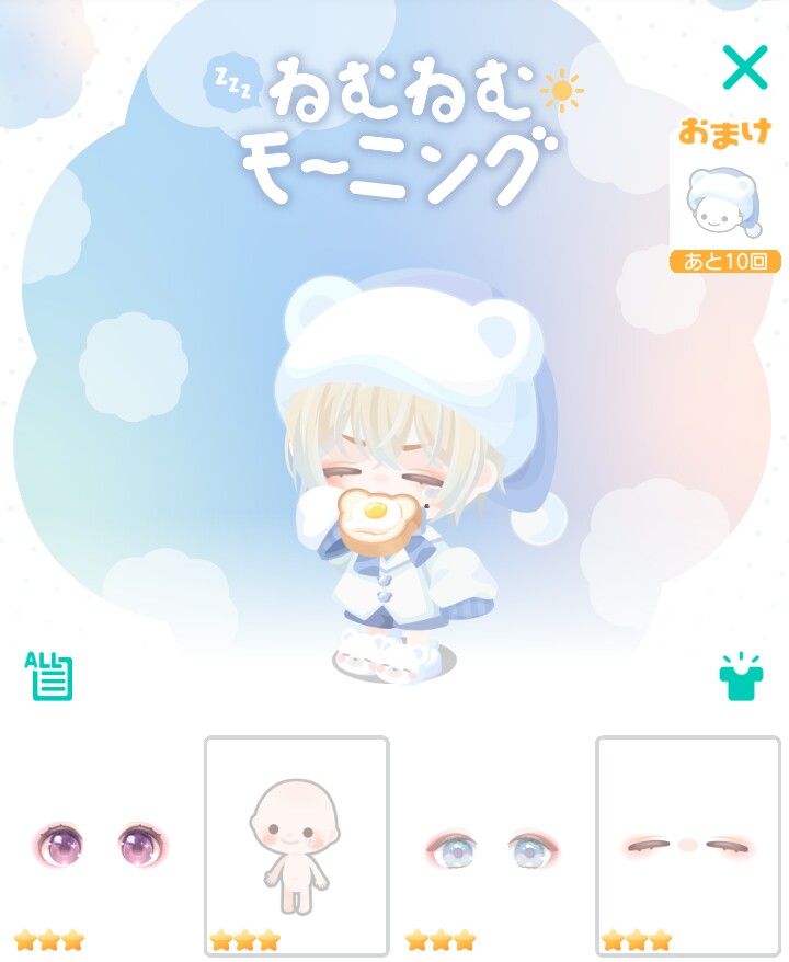 こちらでは3種類の腕の形が変わっているアウターが目玉内容に見える有料ガチャより「ねむねむモーニング」が登場したので記録していきますね(^_-)-☆