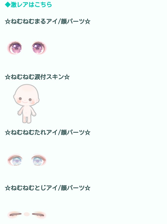 まぁ実際は瞼を閉じている目以外はどれも似たり寄ったりなデザインでいつぞやに出たような目とさほど変わりがないので敢えてこのガチャの激レアを狙っていく必要はなさそうな感じだね( ゚д゚)マジカw