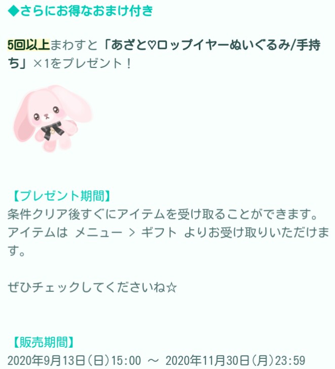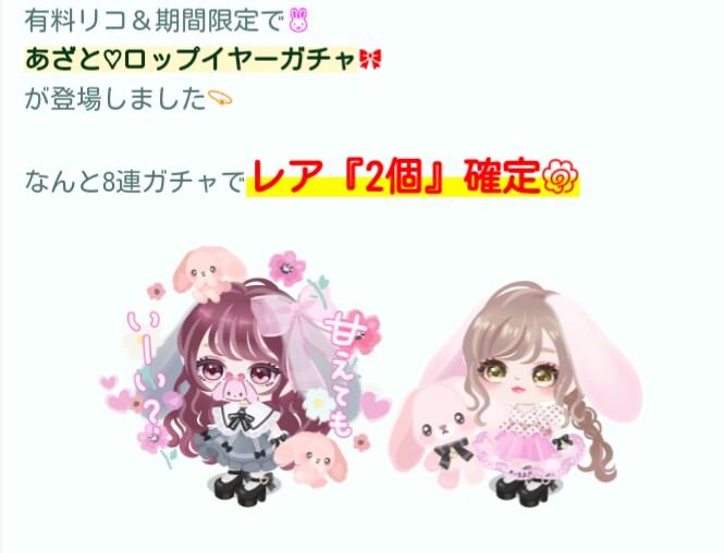 こちらではよ~~~~~っぽど最近の有料に対して課金者が少なくなったのか今までは連ガチャでレア1つ確定だったシステムが今回は8連でレアが2つ確定する仕様になっている有料ガチャより「あざと♡ロップイヤー」が登場したので記録していきますね(^_-)-☆