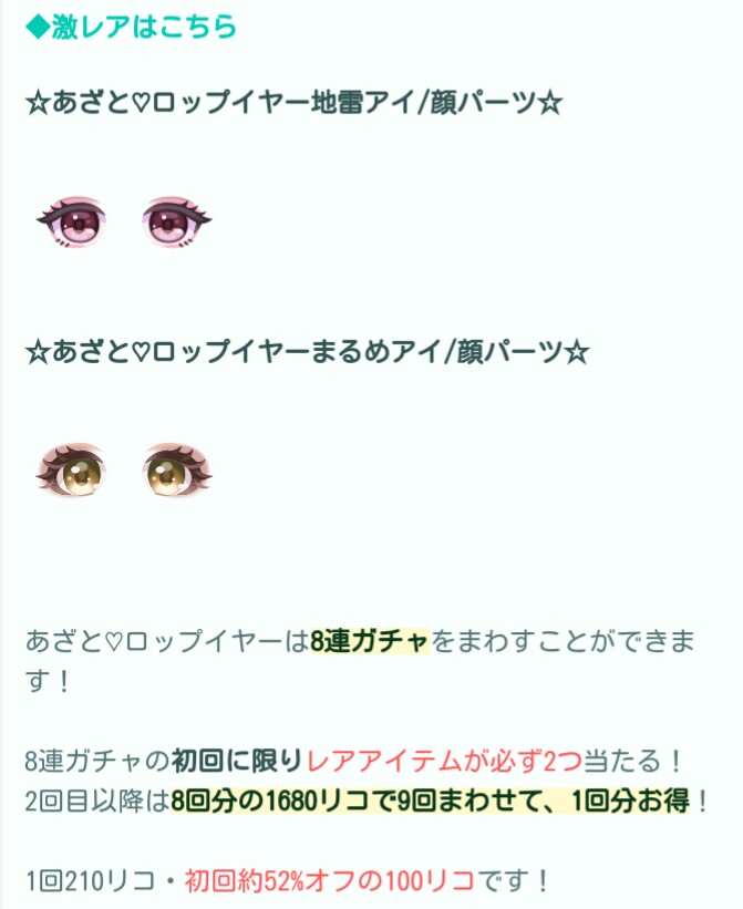まぁどっちかっていうと普段からクソ仕様な低クオリティデザインの顔パーツの目しか出されない無課金ユーザーからすればこういうイベントは少しは美味しいから「無料リコで手に入るならやろうかなw」って感じでしか回されないってことは運営は少しは勉強すべきよねえ((´∀`))ケラケラ