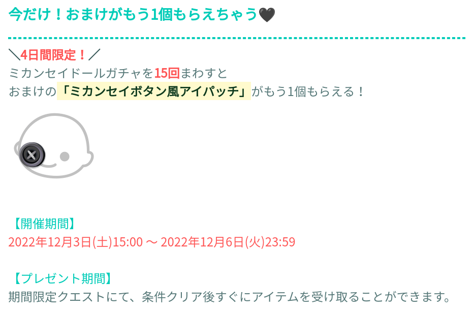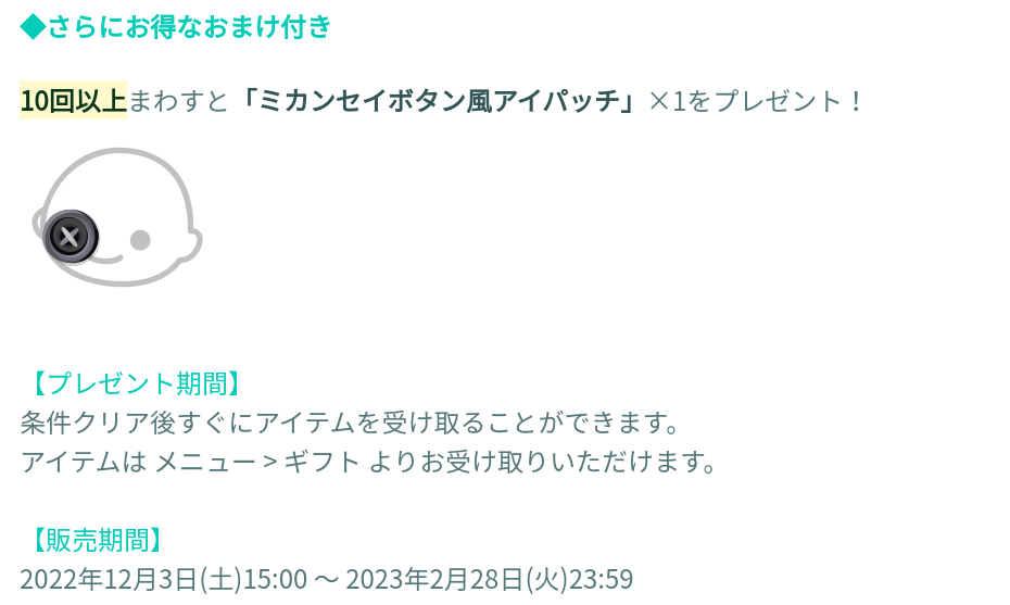 そして販売開始から4日間限定クエストにてそこから5回ぷらすの15回回す事でミカンセイボタン風アイパッチがもう一個貰えるそうですw