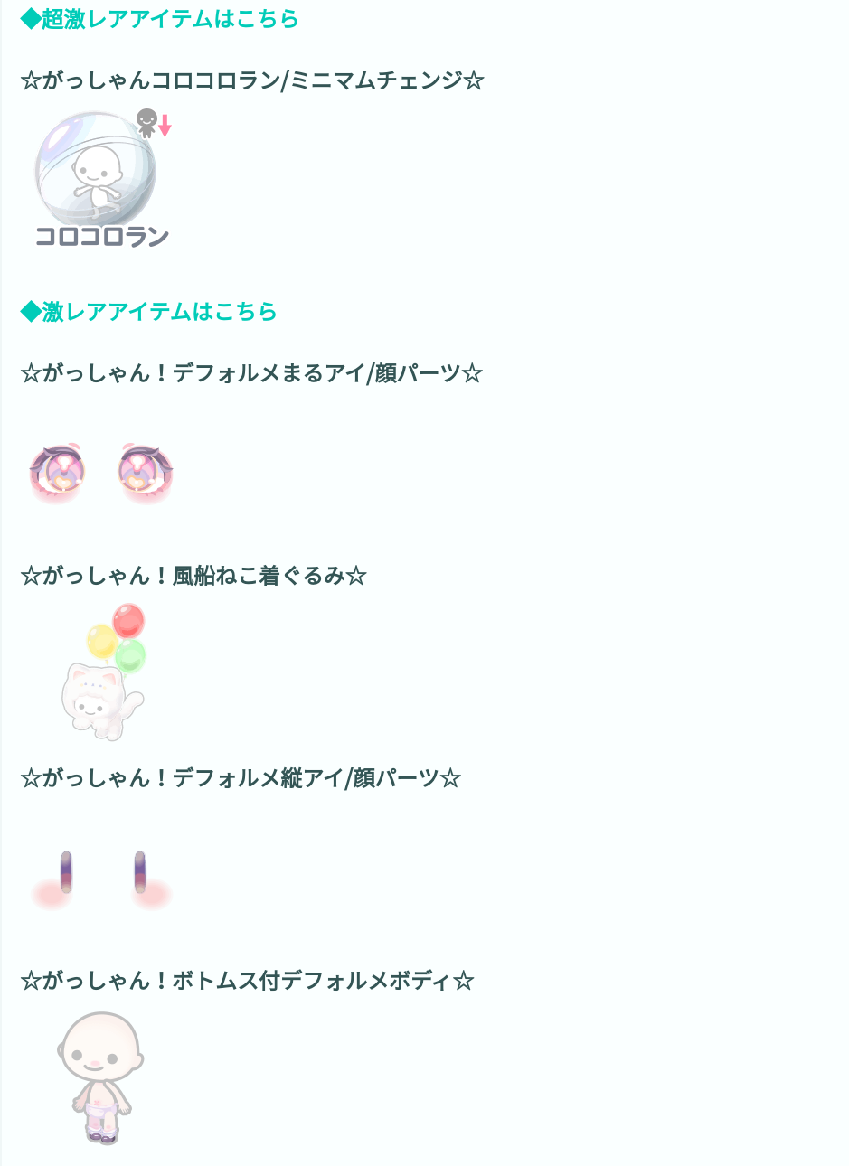激レア設定の方では顔パーツの目や着ぐるみ、そしてボトムス付きのデフォルメボディと、いかにもコロコロランを狙っている重課金者以上のユーザー向けに4つも激レアを設定したんじゃないかと思えるほどの量ですね( ゚д゚)タシカニ