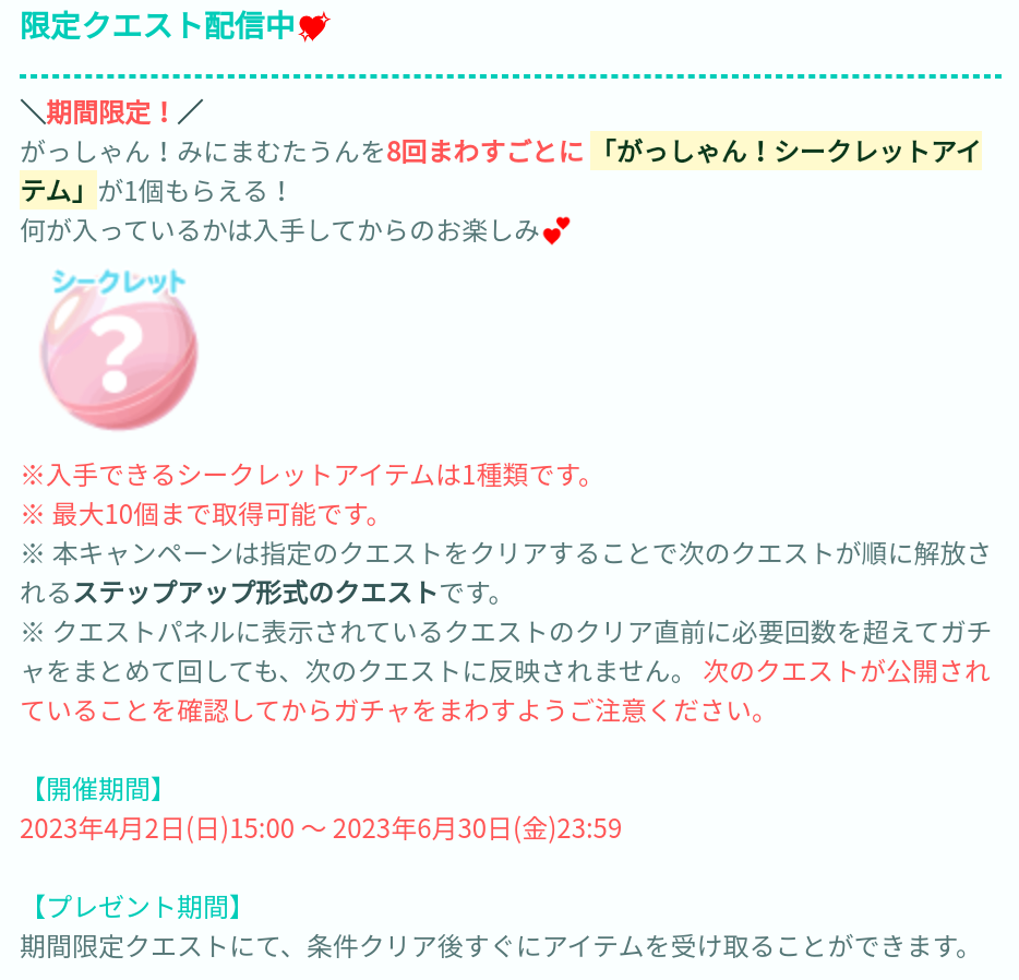 こちらのクエストでは8回回す事でこのがっしゃん!みにまむたむんのアバター(だと思われる)がどれかはいってるみたいですが~正直連ガチャが6連なので+2回分シングルを回して合計で毎回2,000円近くの課金をこのガチャですれば1個ランダムでガチャチケが貰える~って事と変わりがないのでお得に思えないクエストだと思うし、敢えてそれをお得と思える人は1ガチャにつき何万円も課金できる重課金者ユーザーくらいだと思うのでそれらの方々に向けたキャンペーンなんだったらそれ未満なダデェ達のようなユーザーからしたらクエスト非表示をさせてくれた方がまだ(・∀・)イイ!!と思うんだけどあなたならどう思いますか?(。´・ω・)?