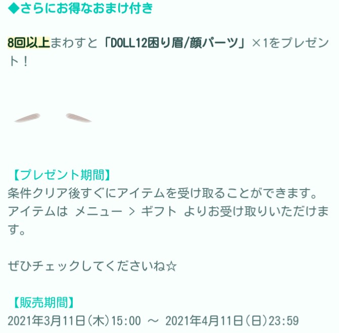 密かに流通しつつある眉パーツが初回の8連で確定する回数のおまけ内容となっているのもあり、初回に限り回すのはおススメなのかもしれませんね(ΦωΦ)シランケドw
