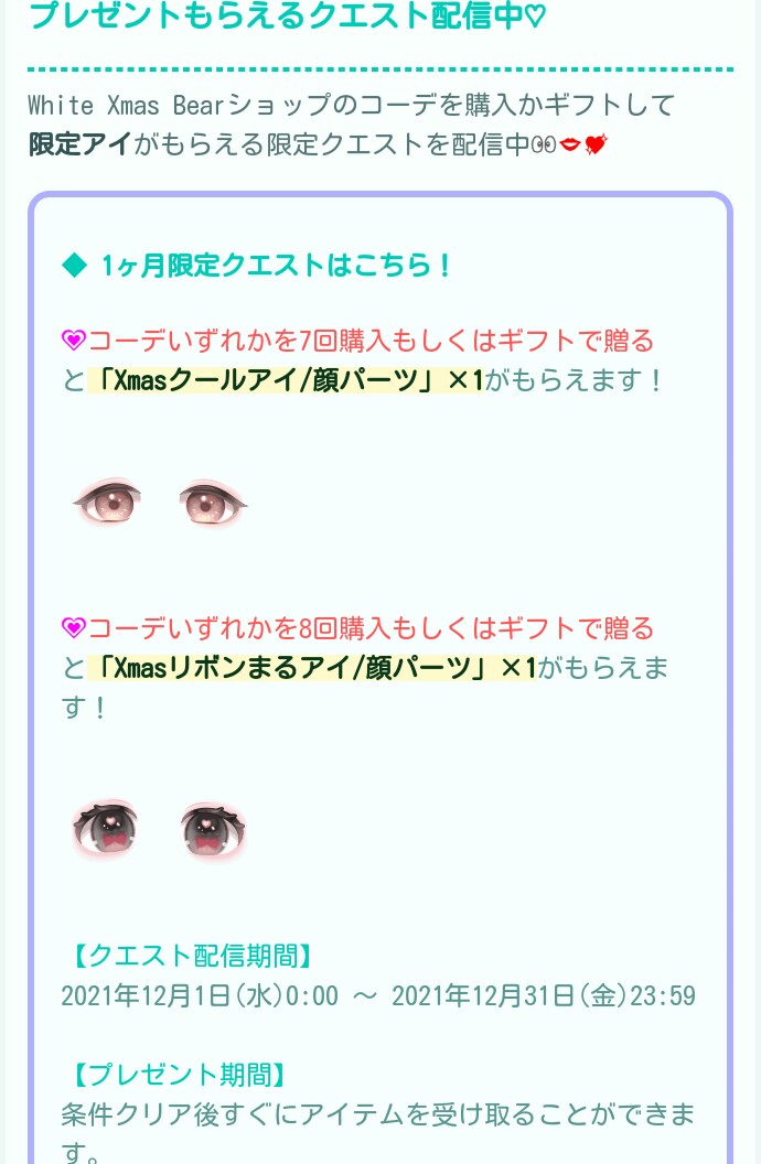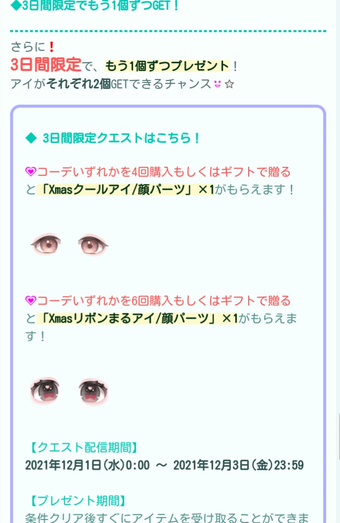 最近のギフクエは余裕で1万越えするコーデ購入額が必須な鬼畜回数設定が定番化しつつあるのでそれに対して諦めを持たせないよう、3日間限定クエストとして少々少ない回数設定にてコーデを複数購入させるような仕組みになっているようにも見えるので課金者ユーザーも一部の重課金者以上のユーザーくらいしかこういったクエストをクリアできないので正直クエストボードも課金と無課金で区分けして欲しいですよねぇw