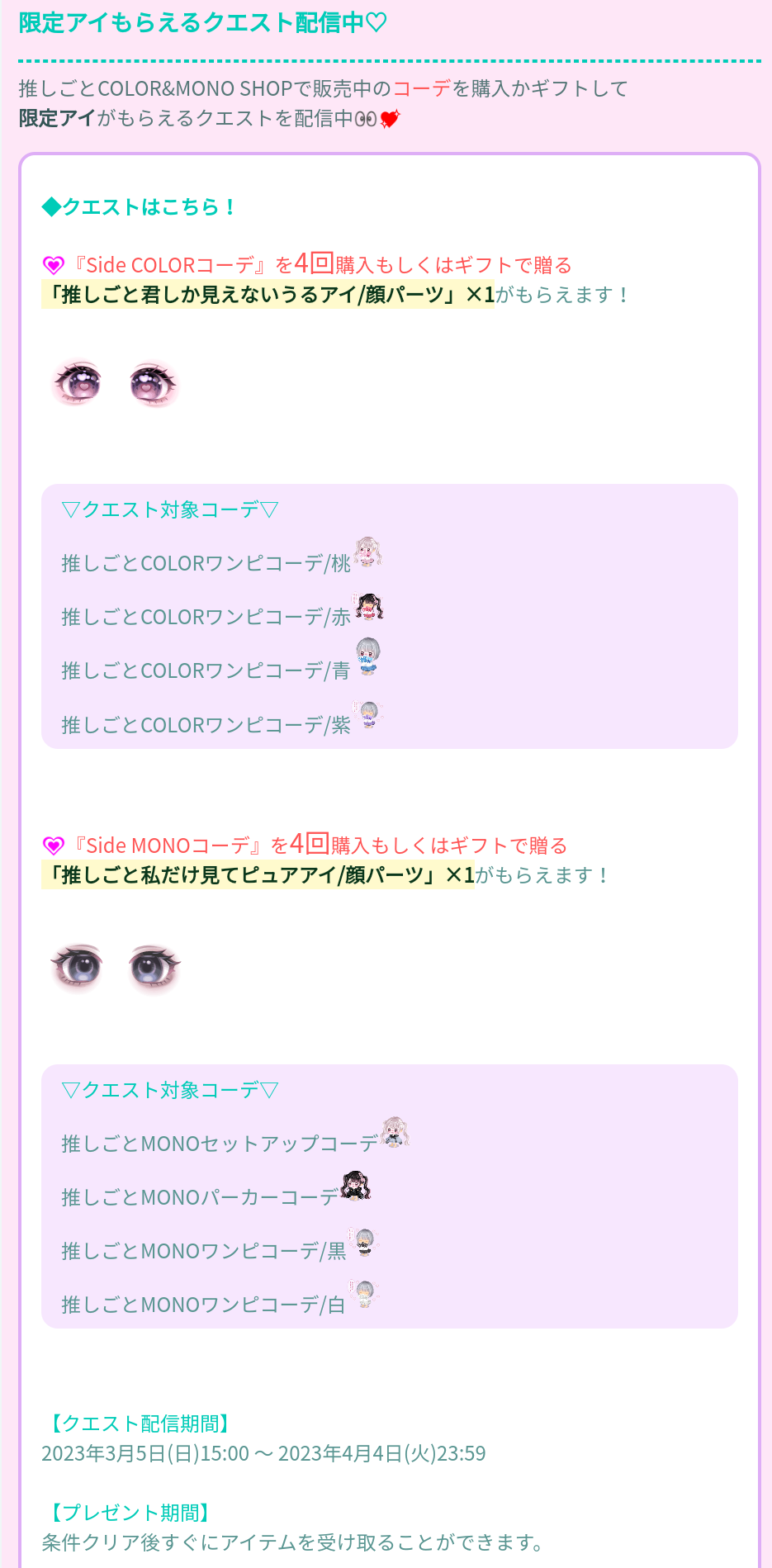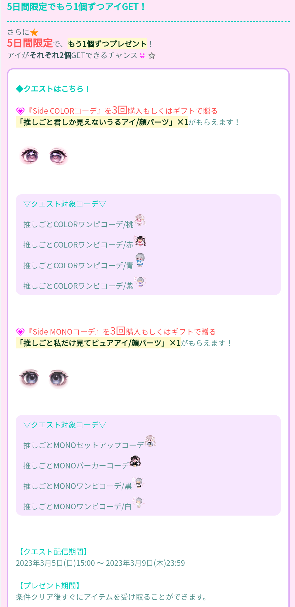 クエスト内容ではタイトル画像にもある左右どちらの顔パーツの目が通常ギフトクエストでは4着分のコーデ、販売開始から5日間限定クエストでは3着分のコーデの購入かギフトにて手に入れる事が出来るという事で顔パーツの目も含めると約5千円の課金が出来る課金者ユーザーの方々には朗報なのかもしれませんねw