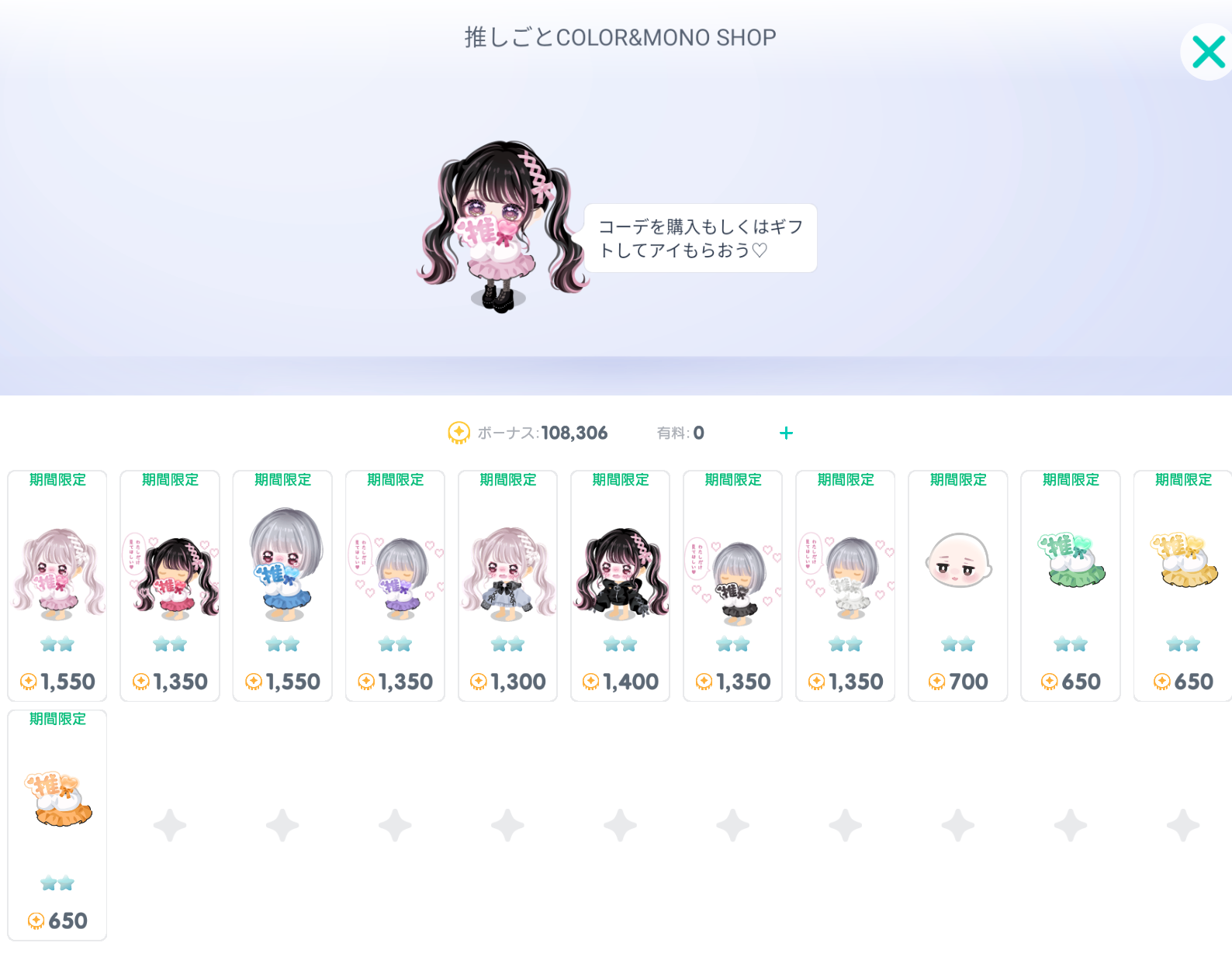 ショップ内容ではただの色違いのコーデが売っているだけでなく、ムードやお面などもセットでついている他比較的に値段も約1,500円と手ごろな内容にはなっているのでギフトクエストなどの顔パーツの目は狙わない微課金ユーザーの方々には有りな内容なのかもしれないねwって思ったダデェでしたwww