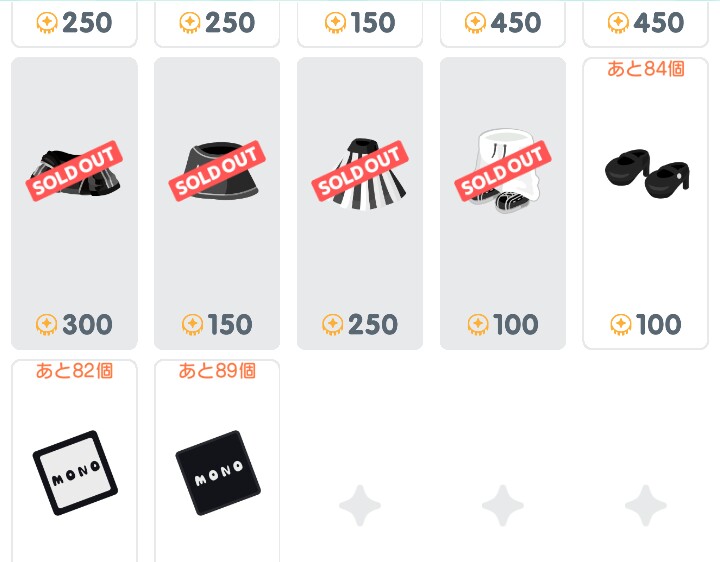 あ~あ~wこれを見て解る通り、500リコ以下のアイテムはソールドアウトになっているのにコーデは男の子物くらいしか売り切れになっていないって事は、女の子コーデはそこまで人気無いし、男の子コーデが売り切れたから個別で単品アイテムを買ってるんだろうね(ΦωΦ)シランケドw
