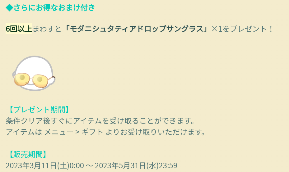 おまけ内容では有料も無料もどちらも初回の連ガチャであと1回分足りないというおまけとは呼べないであろう回数設定となっていてそれでいて敢えてこのサングラスを狙うほどの魅力ってあるのか?って思える内容なのでホントのホントでおまけっていうコンテンツとして機能してないと思いますよねぇ(´・ω・`)