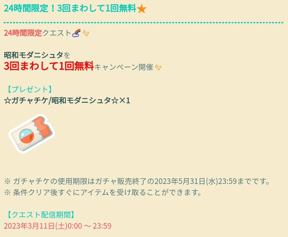 販売開始より24時間限定クエストとして3回回せばこのガチャが1回回せるガチャチケキャンペーンが行われているという事で~唯一の利点を上げるとすれば、上記でのおまけが連ガチャであと1回回す回数が足りないって言う事なので当日限定で連ガチャを回せばおまけまで貰えるという事くらいですかね?(ΦωΦ)シランケドw