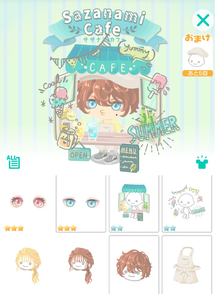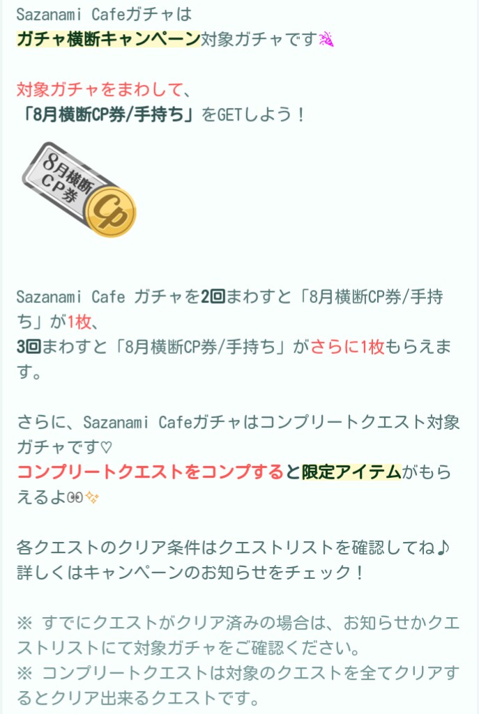 こちらでは8月の有料無料選択ガチャにて相変わらずの低クオリティ製作な内容の「Sazanami Cafe」が登場したので記録していきますね(^_-)-☆