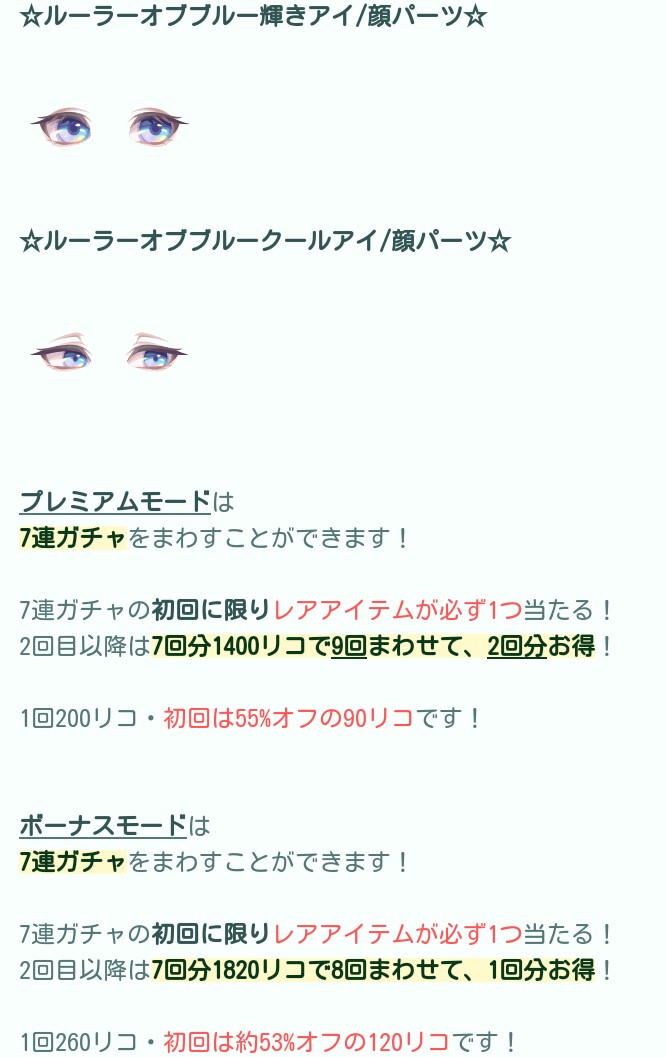 結局この顔パーツの目とかも普段の有料無料選択ガチャのクオリティデザインレベルが低いから回される事もなく全ユーザーが無料リコが貯まっていくので、こうかん機能でも