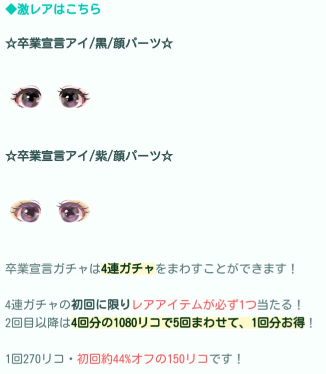 うんwまぁ無料内容にしては目の大きさやデザインクオリティは高めに設定してあるけどさガチャ内容自体が4連システムなので、目が出るまで出そうと思うと相当しんどい気がするって思うのはダデェだけ(。´・ω・)?
