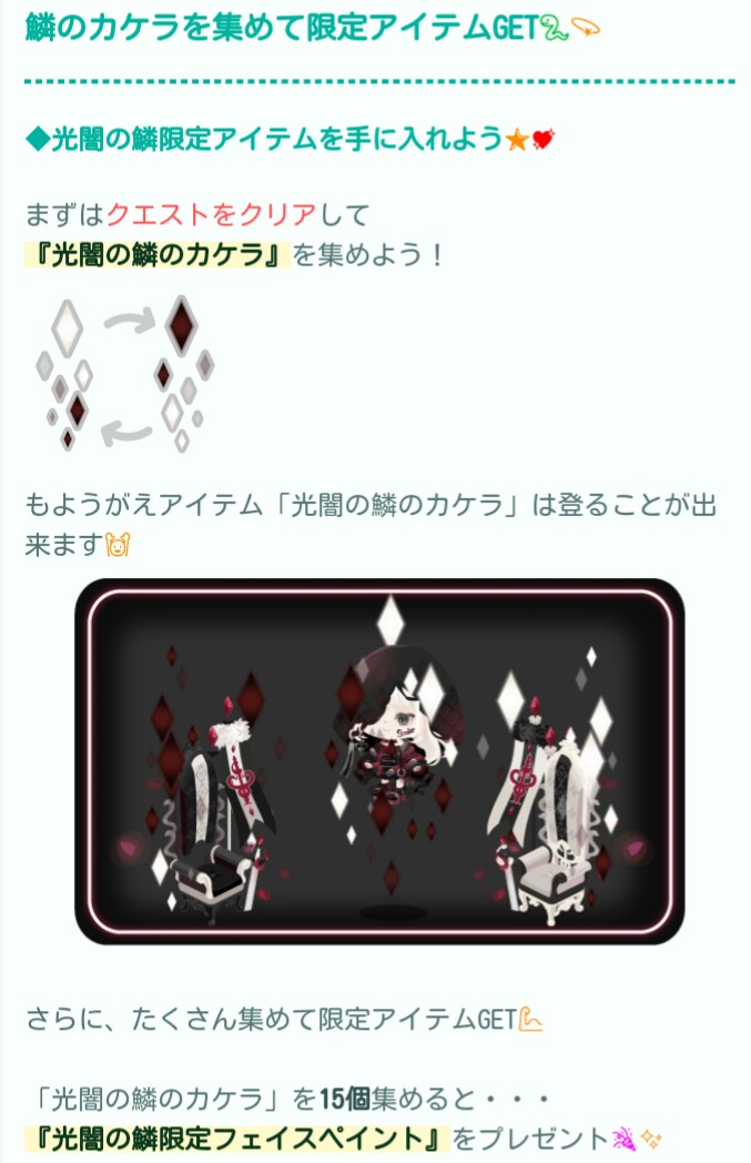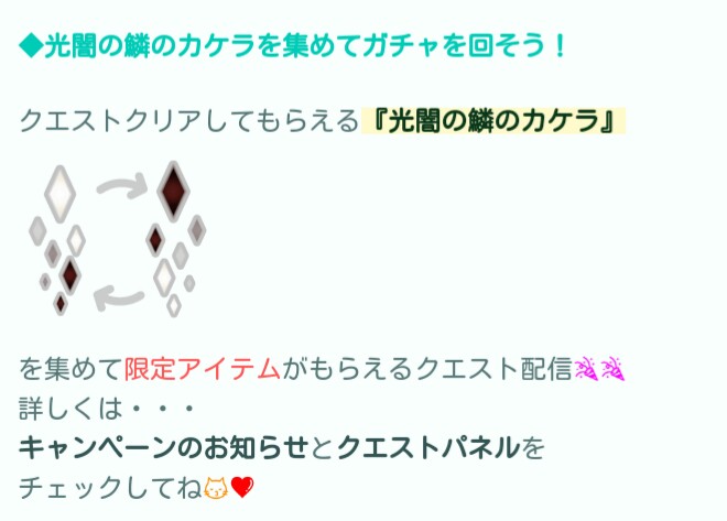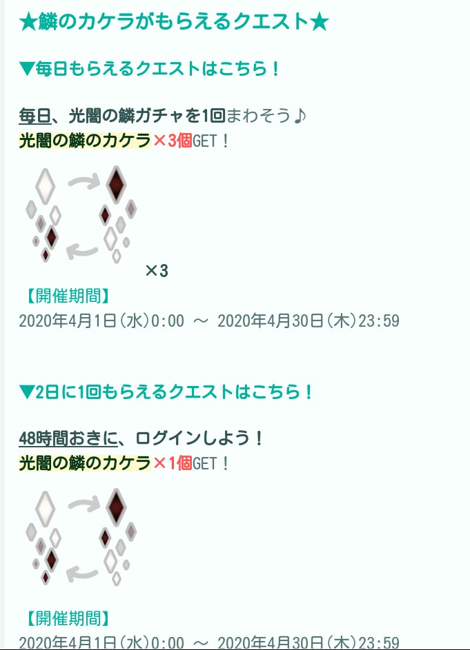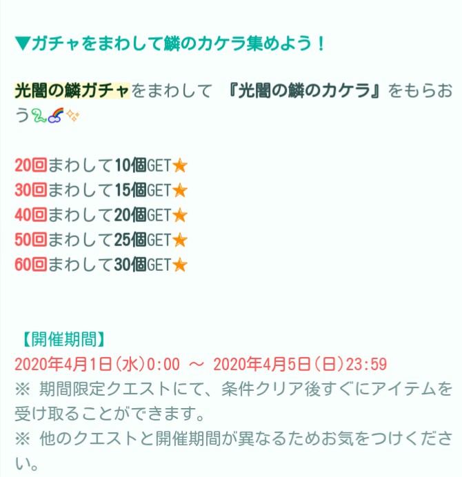 コチラでは今回の光闇の鱗ガチャと連動したクエストで鱗の欠片を集めると限定アバターが貰えるクエストが登場しているので記録してってます(=゚ω゚)ノ