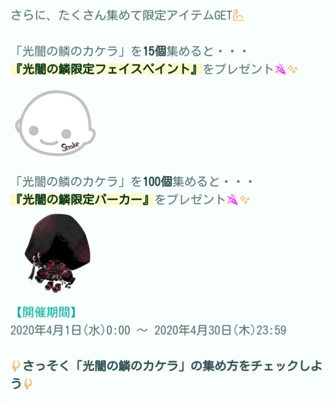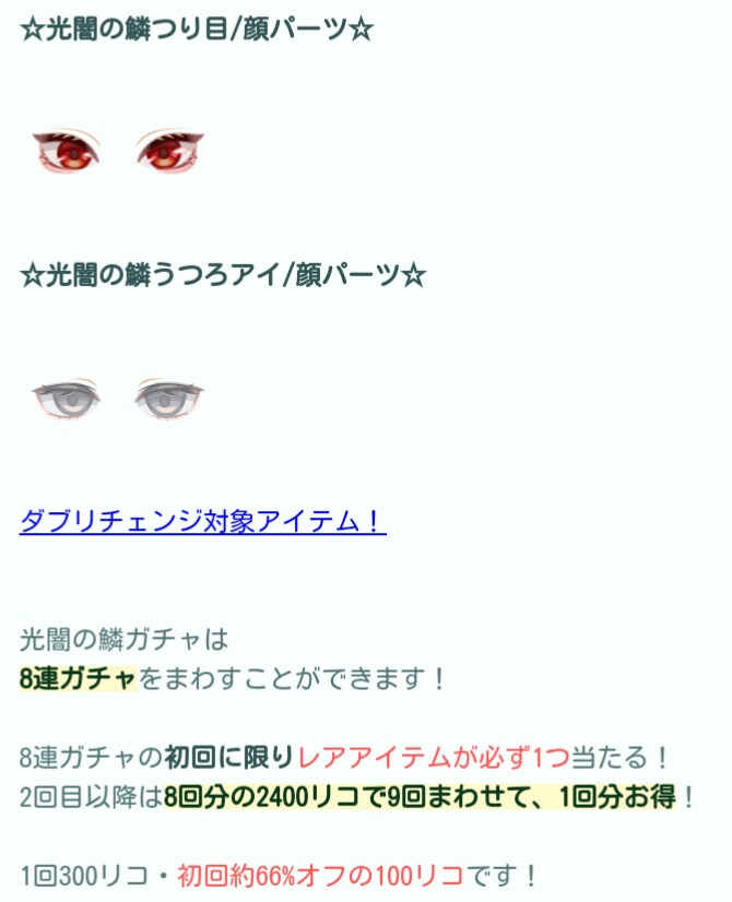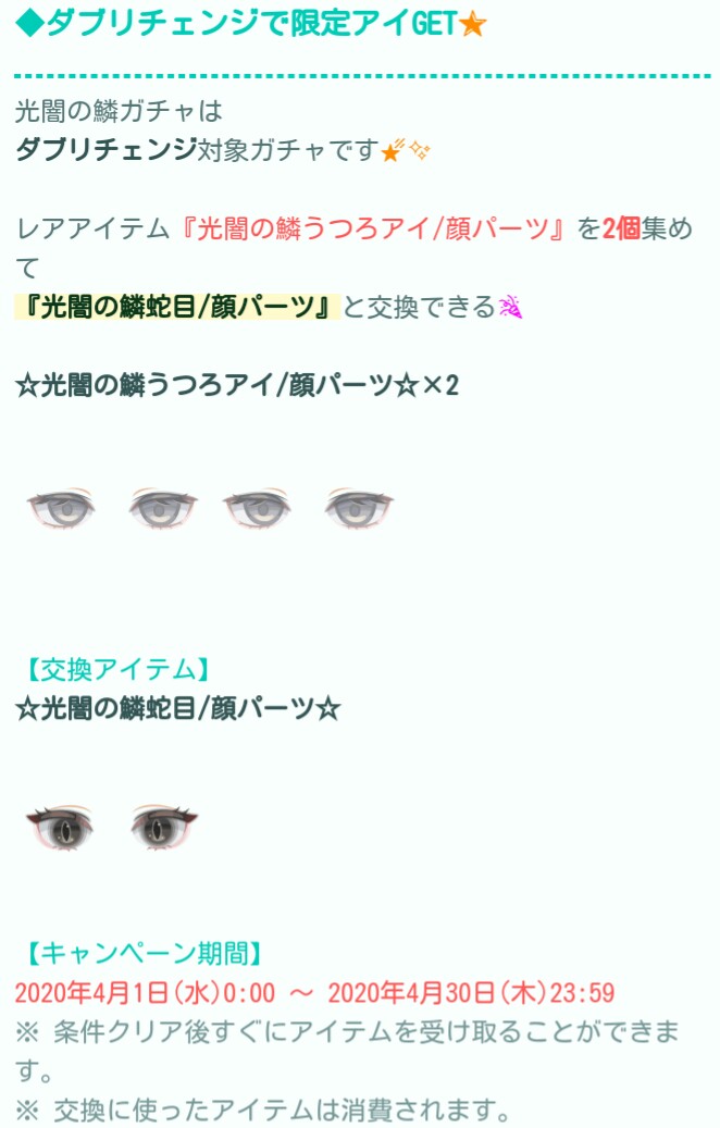 はいwでは今回は4月が始まって新社会人や新学期など新規一転する世界の中でピグパでは「これどっかで見たことない?」って思われる無料ガチャより「光闇の鱗」が登場したので記録していきますね(^_-)-☆