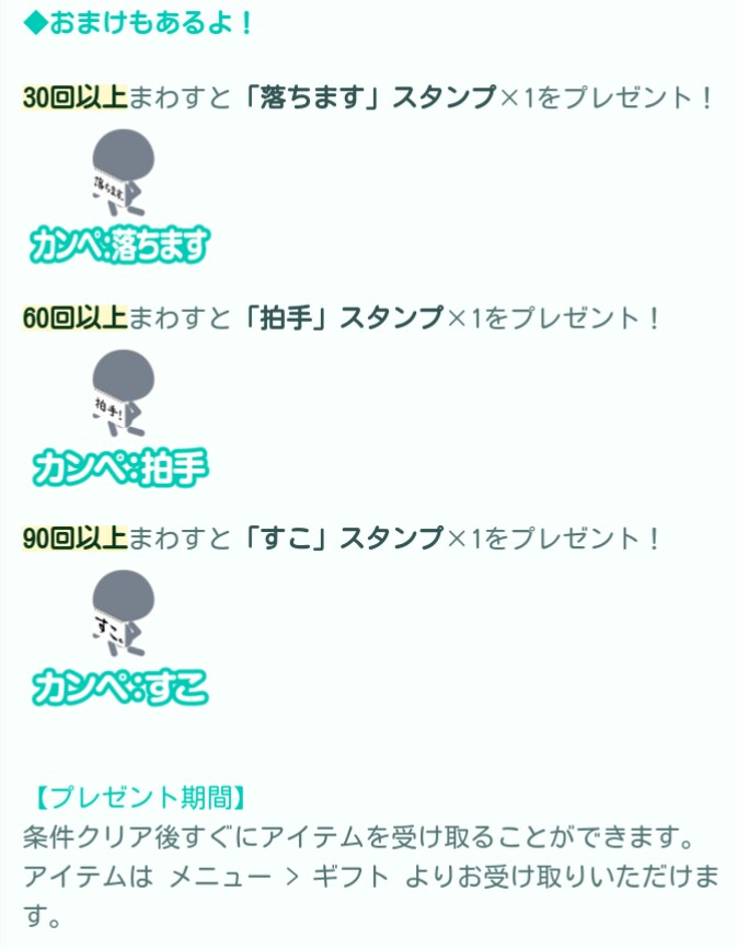 ログインやキュンなど普段ならすぐに達成できる内容なんだけど、それだと7枚しかもらえず、1日に貰える枚数が24枚となっていて、それを全て貰う方法がクソ仕様でしたね( ´ー`)フゥー...
