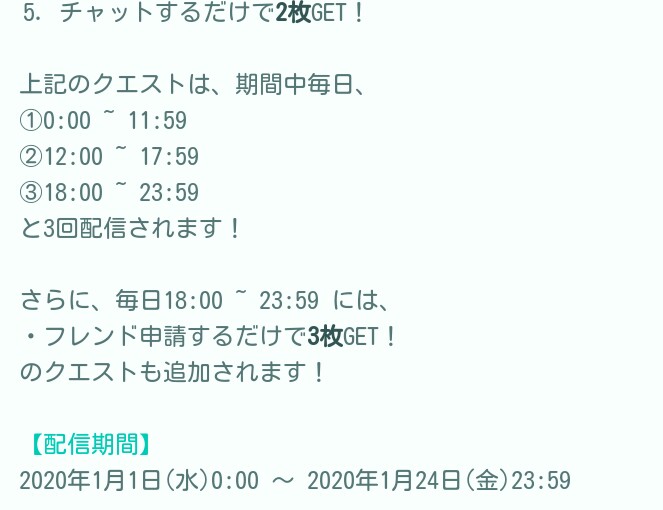 チケットもらう方法はクエストを達成させるのはもちろんのこと、毎日のデイリークエストに含まれたりしているので併せてやりやすい状況ではあるんですが、今年はなんと…ログインさせるためにクッソめんどい仕様になってましたΣ(゚д゚lll)ガーン