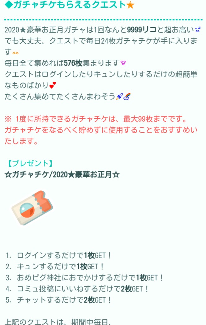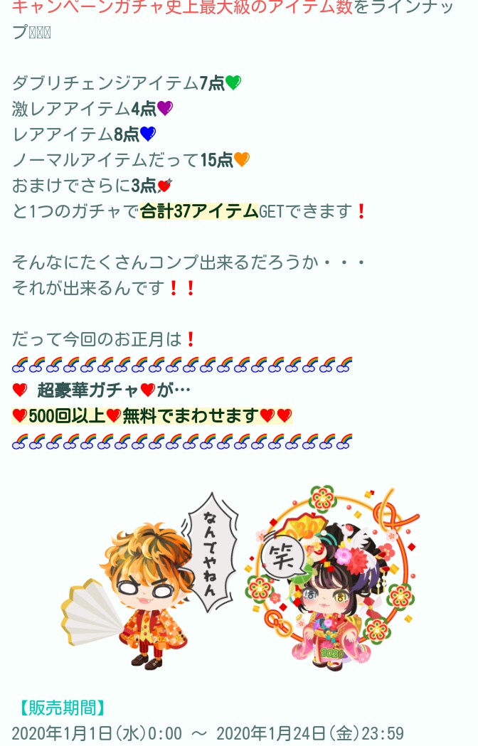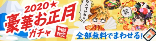 はいwでは今回は2020年の始まりで毎年恒例のガチャチケ回収からの無料引きするためのガチャから「2020★豪華お正月ガチャ」が登場したので記録していきますね(^_-)-☆