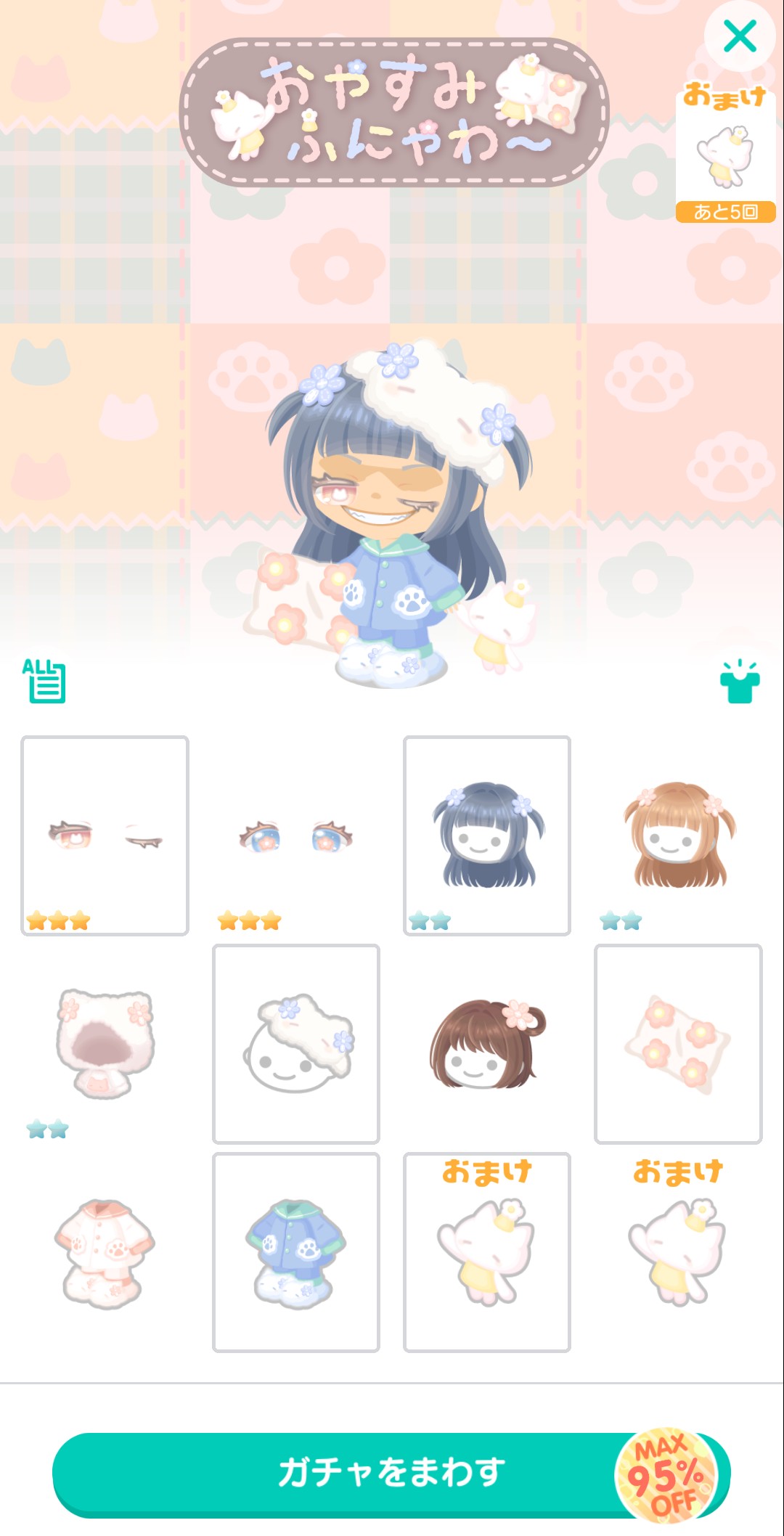 おまけ内容では初回の連ガチャで貰える5回(連ガチャは6連のため)+10回にて