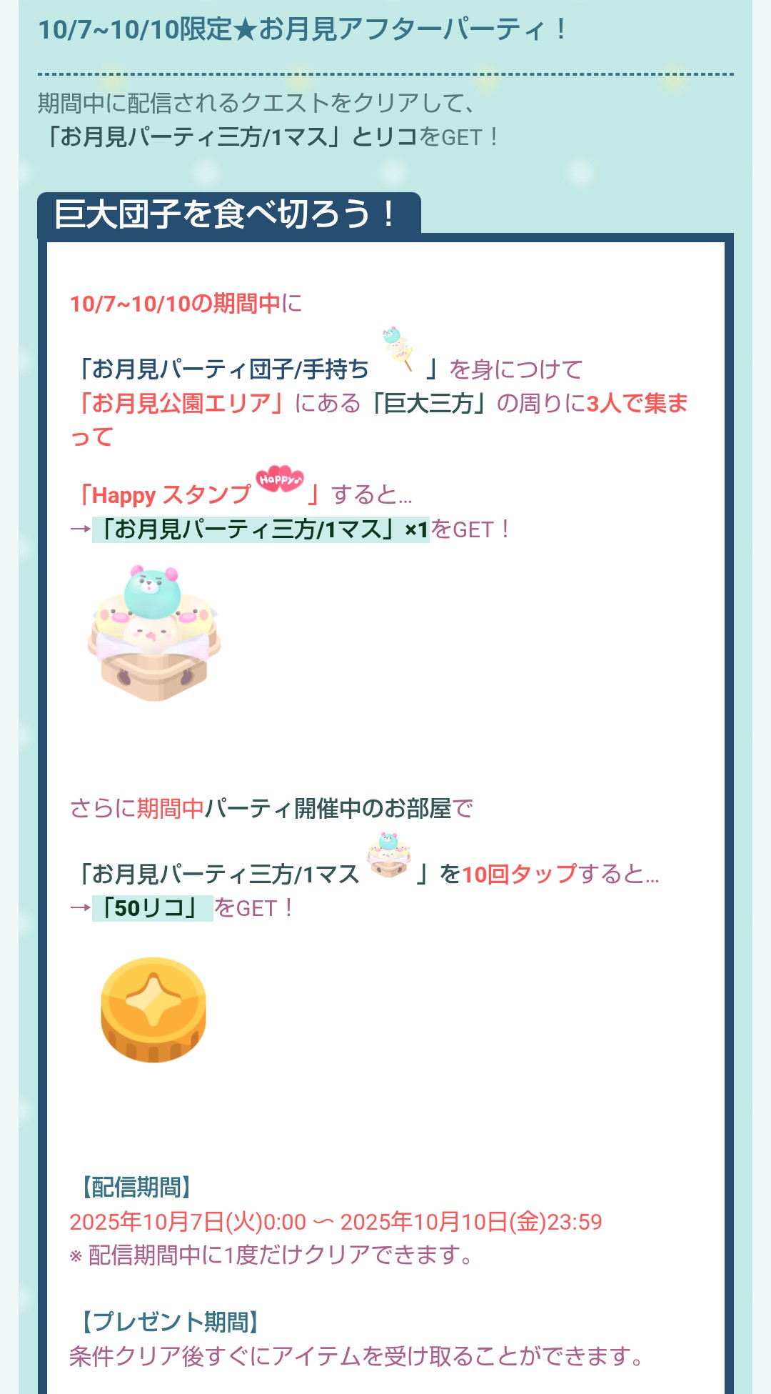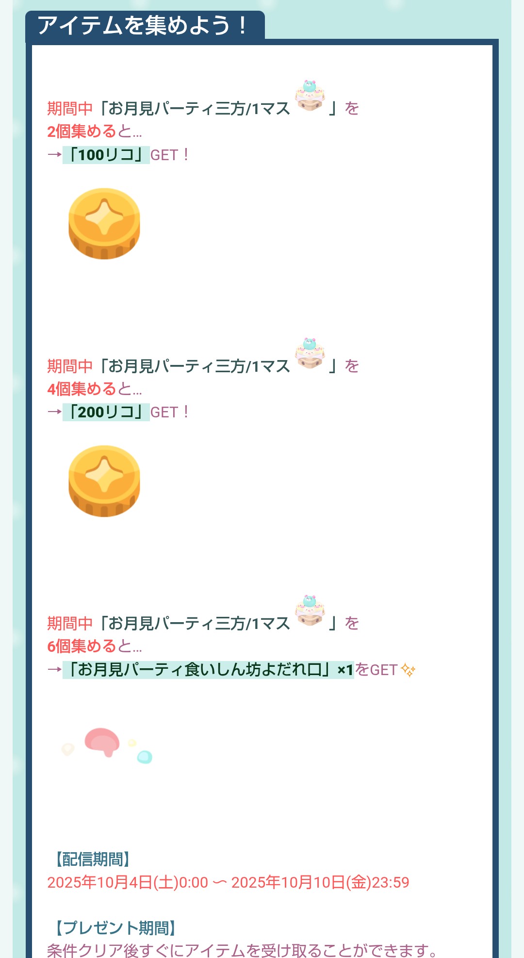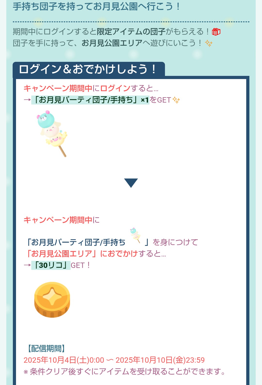 お月見パーティ団子(手持ちアイテム)が貰えるので、