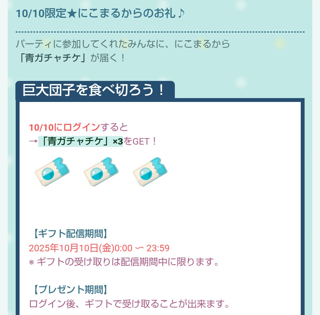 ラストは10/10日にてログインするだけで青ガチャチケが3枚貰えるクエストとなっています。