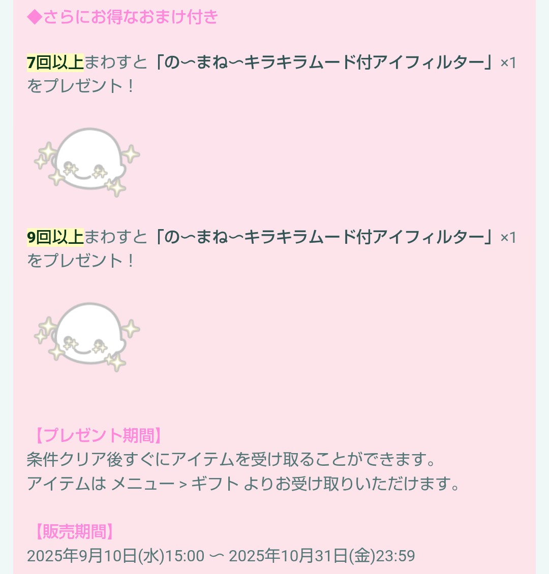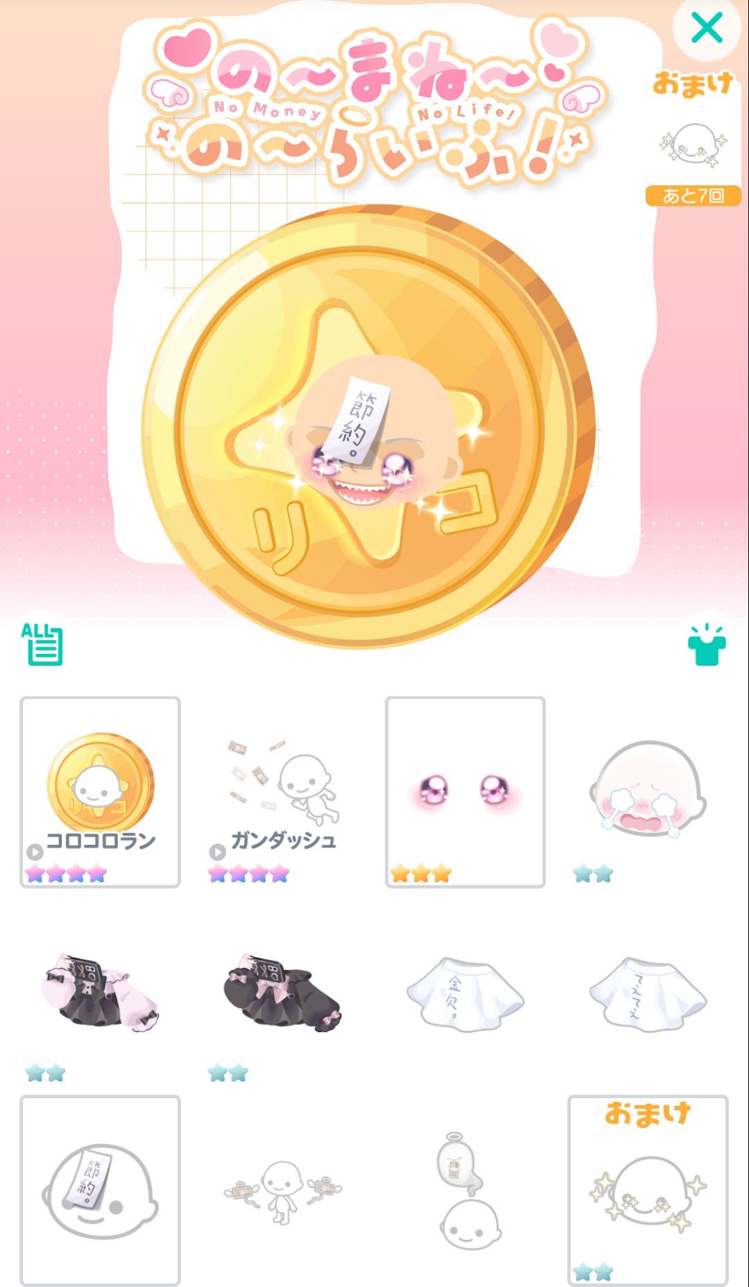 おまけ内容では初回の連ガチャではあと1回足りないシリーズの7回(連ガチャは6連のため)+9回にて