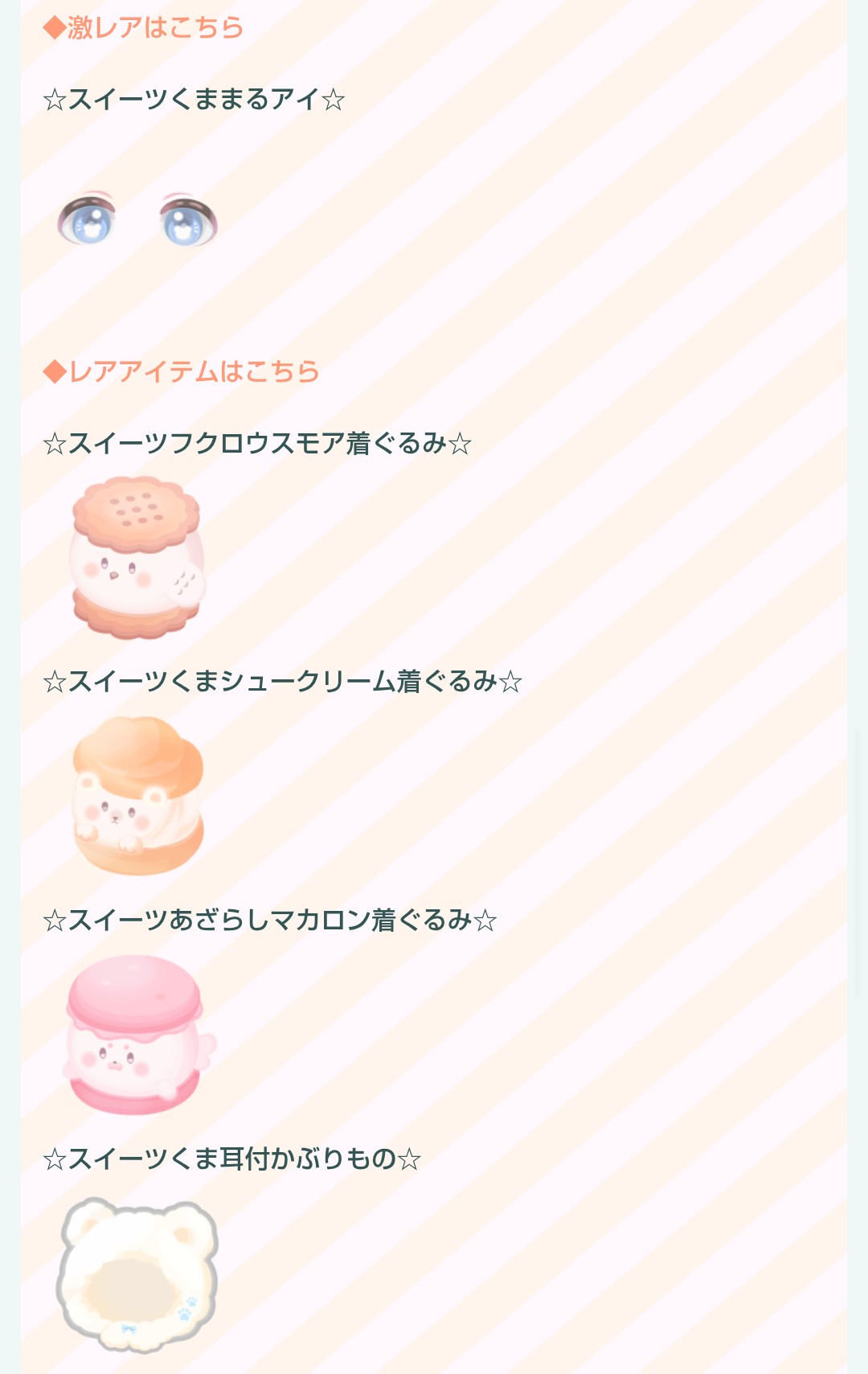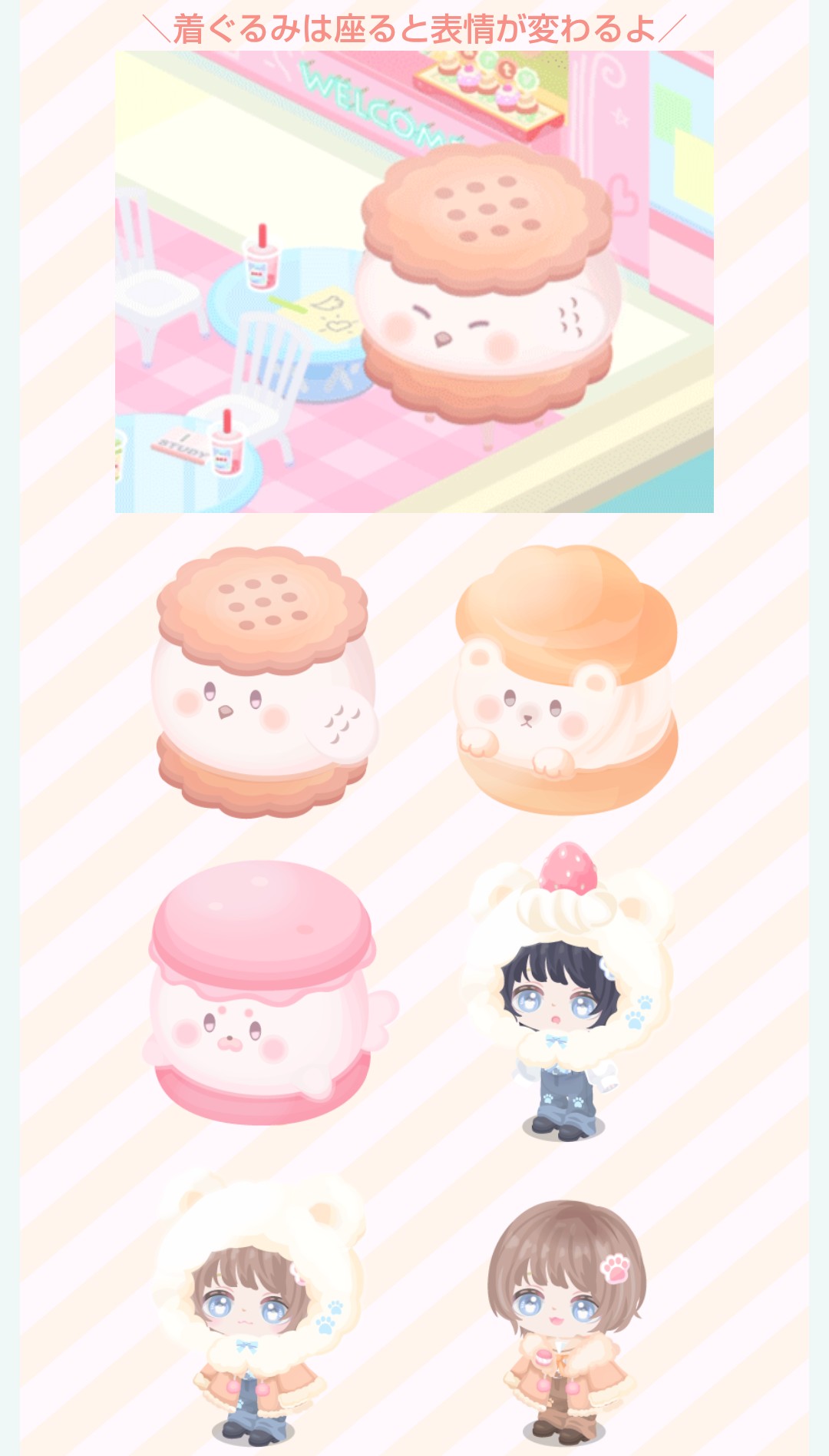 それぞれスイーツの着ぐるみが3種類にくま耳付きのかぶりものとなっていて