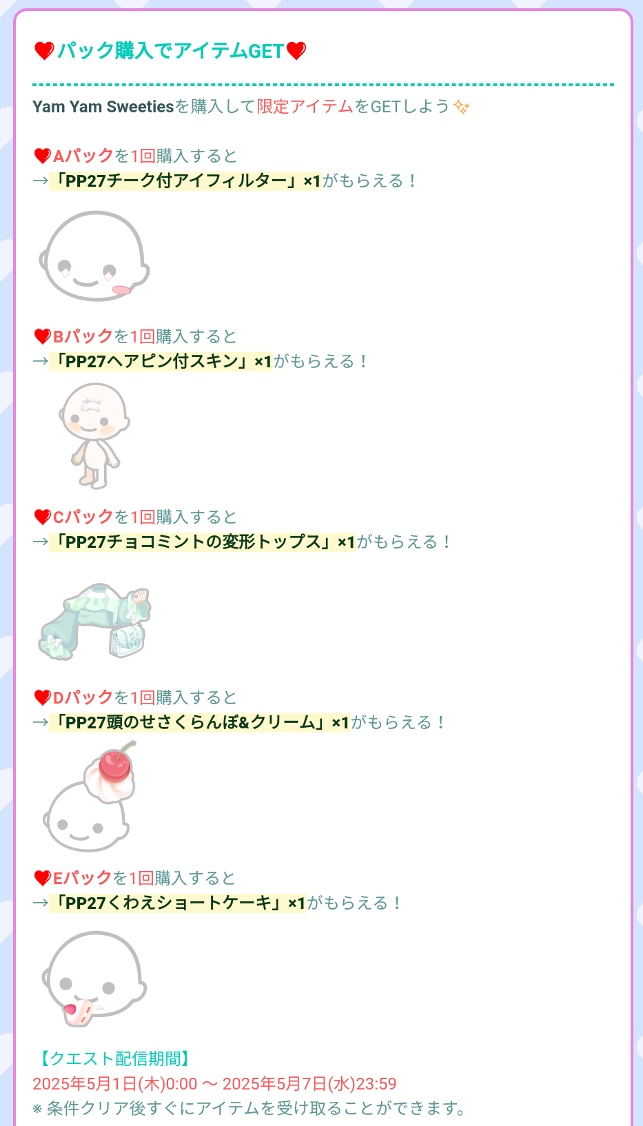 こちらでは2025年5月のポッピンパックより「Yam Yam Sweeties」が登場したので記録していきますね(^_-)-☆