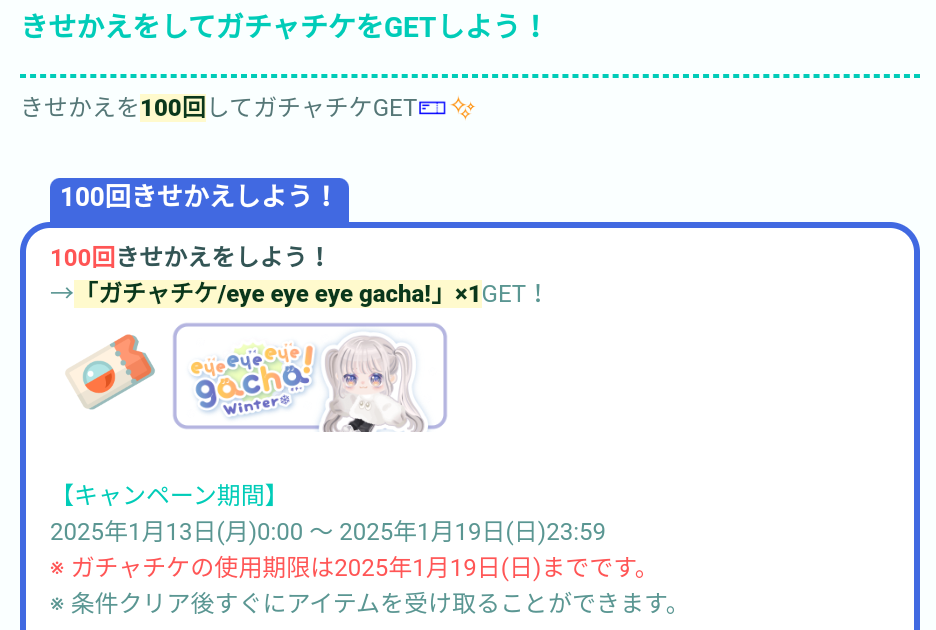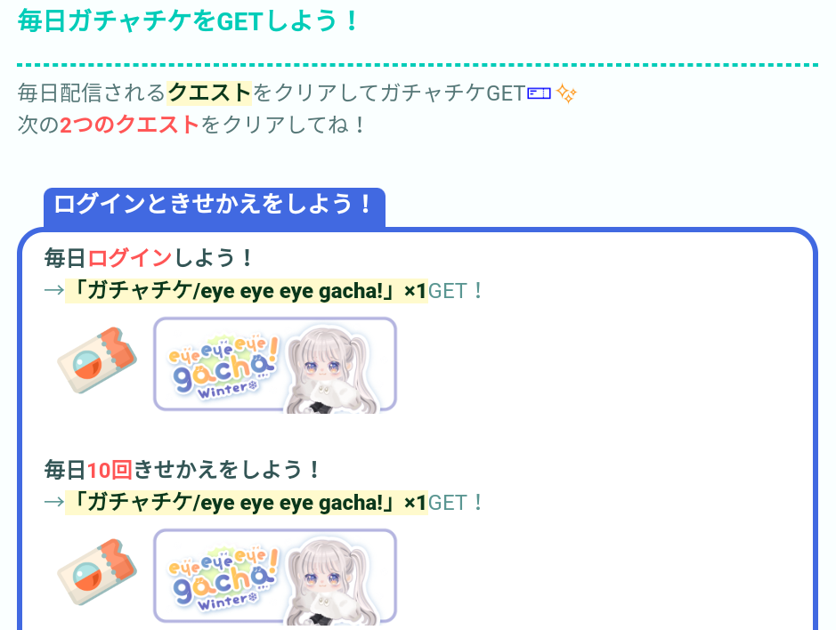 これらをクリアすることで毎日2枚ずつガチャチケがもらえ、きせかえ100回で+1枚(初回のみ)貰えるっていうことなので~