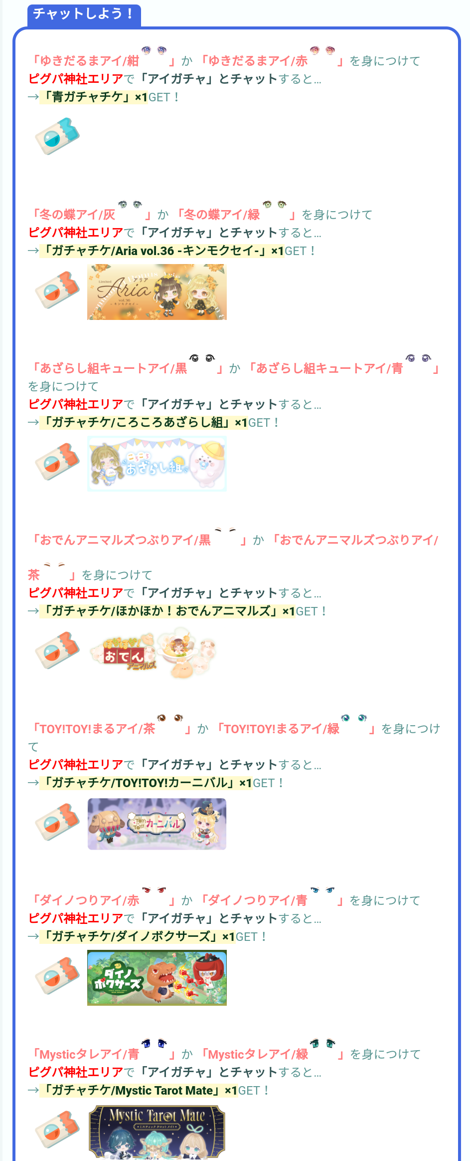 ピグパ神社エリアにて『アイガチャ』とチャットすることで