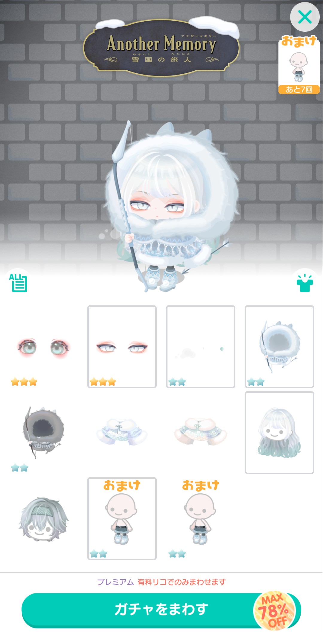 おまけ内容では初回の連ガチャではあと1回足りないシリーズのちょい残念な7回(連ガチャは6連のため)+9回にて
