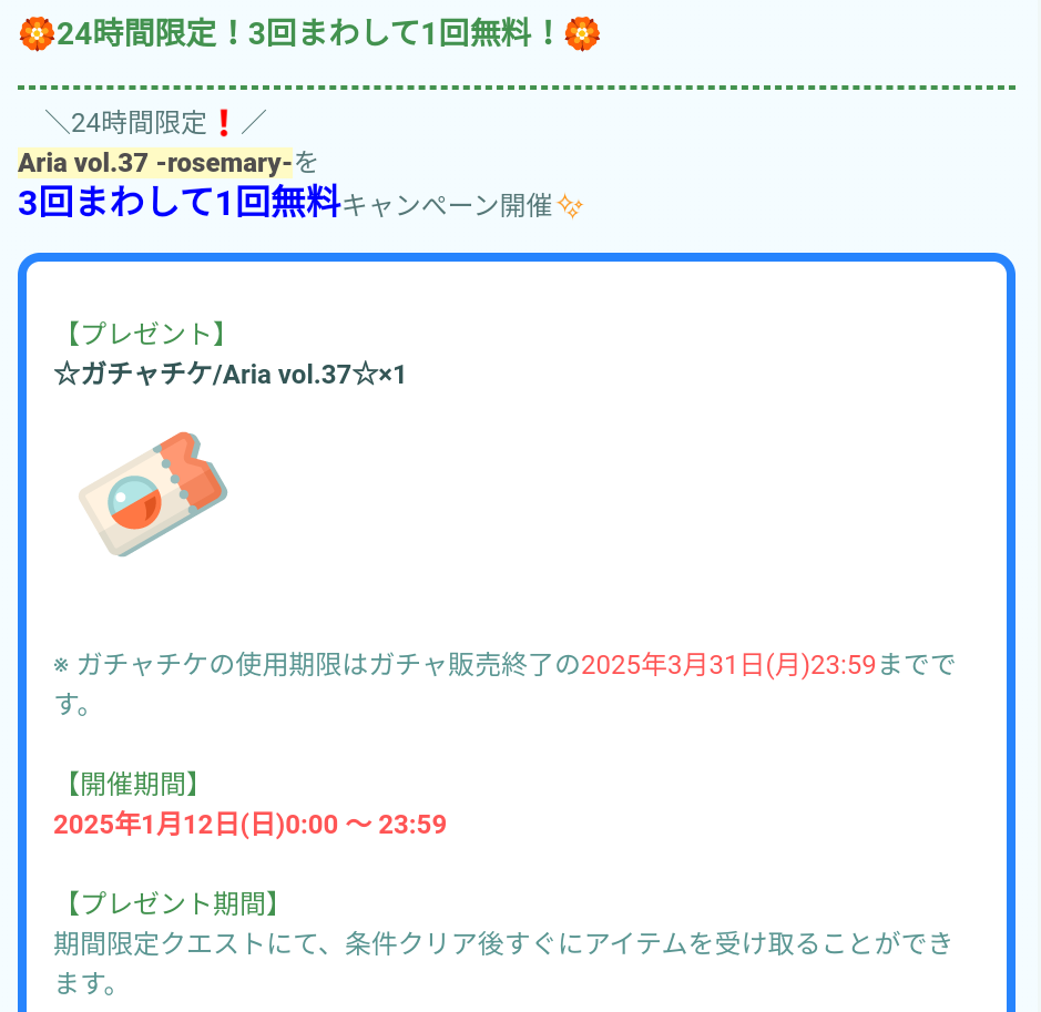 販売開始から24時間限定クエストとしてこちらのガチャを3回回すことで