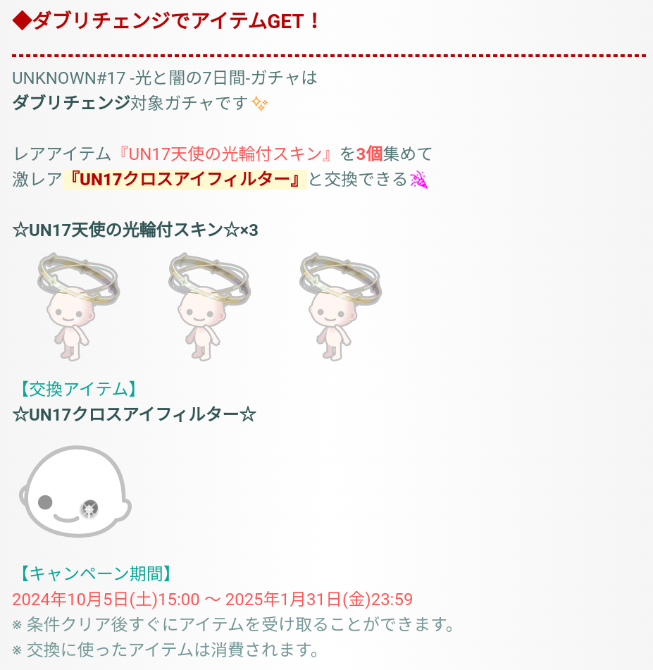 ダブリチェンジ内容ではレア設定にある天使の光輪付スキンが3つで片方だけが光るアイフィルターと交換となっているんだけど、